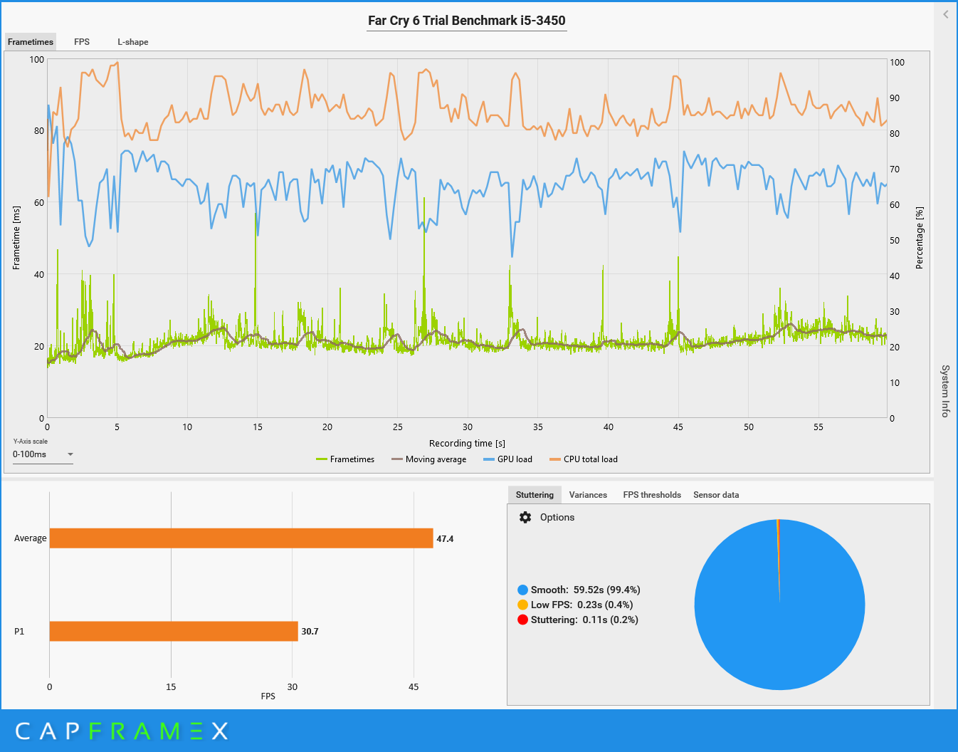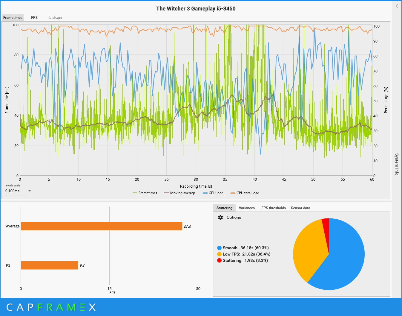 Ich habe zum besseren Vergleich die Frametimes auf 0-100 ms gestellt und alle Aufzeichnungen auf 60 Sekunden beschnitten. Als zusätzliche Anzeige ist die Auslastung von CPU und GPU aktiviert worden.