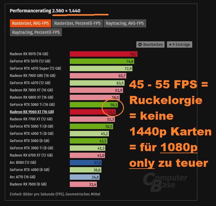 dann mĂŒssten alle anderen karten auch durch dein raster fallen. denn die preis/leistung(fps) wird nur schlechter um so höher die klasse.ChrisMK72 schrieb:300-400 ⏠als gĂŒnstiger Einstieg ins ordentliche PC-Gaming?
