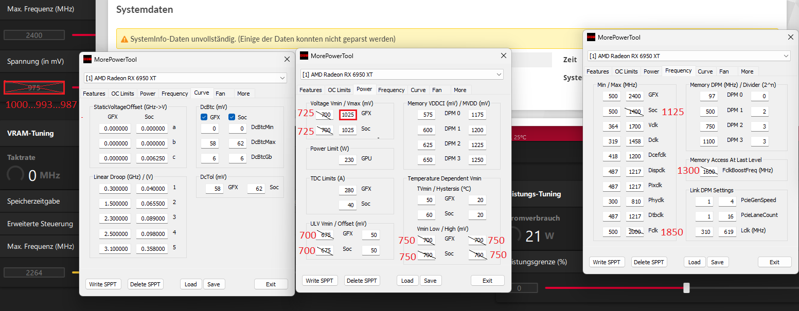 Im MPT lege ich die Minimal- und Maximalspannung der jeweiligen Komponente auf der Grafikkarte fest. Mit dem Treiber stelle ich dann die Taktraten und das Spannungs-Offset, sowie die Lüfterkurve ein. Der RadeonSoftwareSlimmer hilft mir das Ryzen Master SDK und Automatisierungen des Treibers garantiert zu unterbinden.