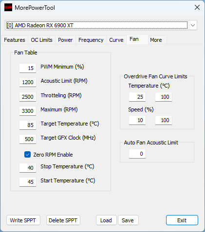 Im MPT lege ich die Minimal- und Maximalspannung der jeweiligen Komponente auf der Grafikkarte fest. Mit dem Treiber stelle ich dann die Taktraten und das Spannungs-Offset, sowie die Lüfterkurve ein. Der RadeonSoftwareSlimmer hilft mir das Ryzen Master SDK und Automatisierungen des Treibers garantiert zu unterbinden.