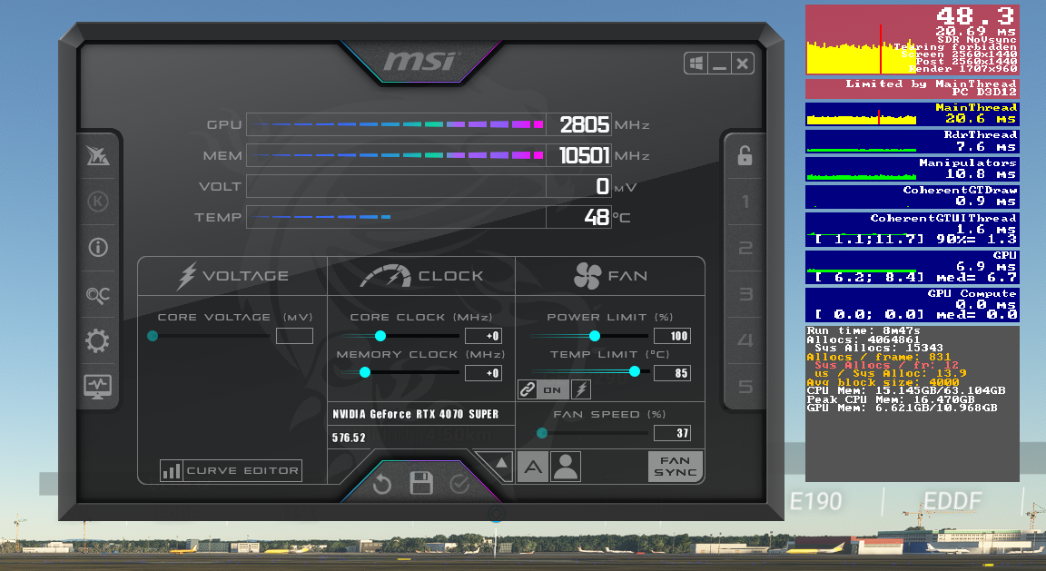 Dein Problem ist vermutlich, dass Frame Gen nur zieht, wenn das Sim-Fenster im Fokus ist. Wenn Du also das MSI Afterburner overlay siehst, ist das Sim Fenster nicht im Fokus und Framegen schaltet sich aus. Daher hast DU oben rechts auch in der Anzeige nicht den Vermerk "SDR Frame Gen", sondern lediglich "SDR NoVsync".Niklas_1406 schrieb:Anhang anzeigen 1624881
