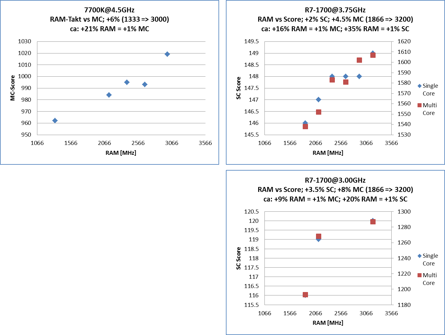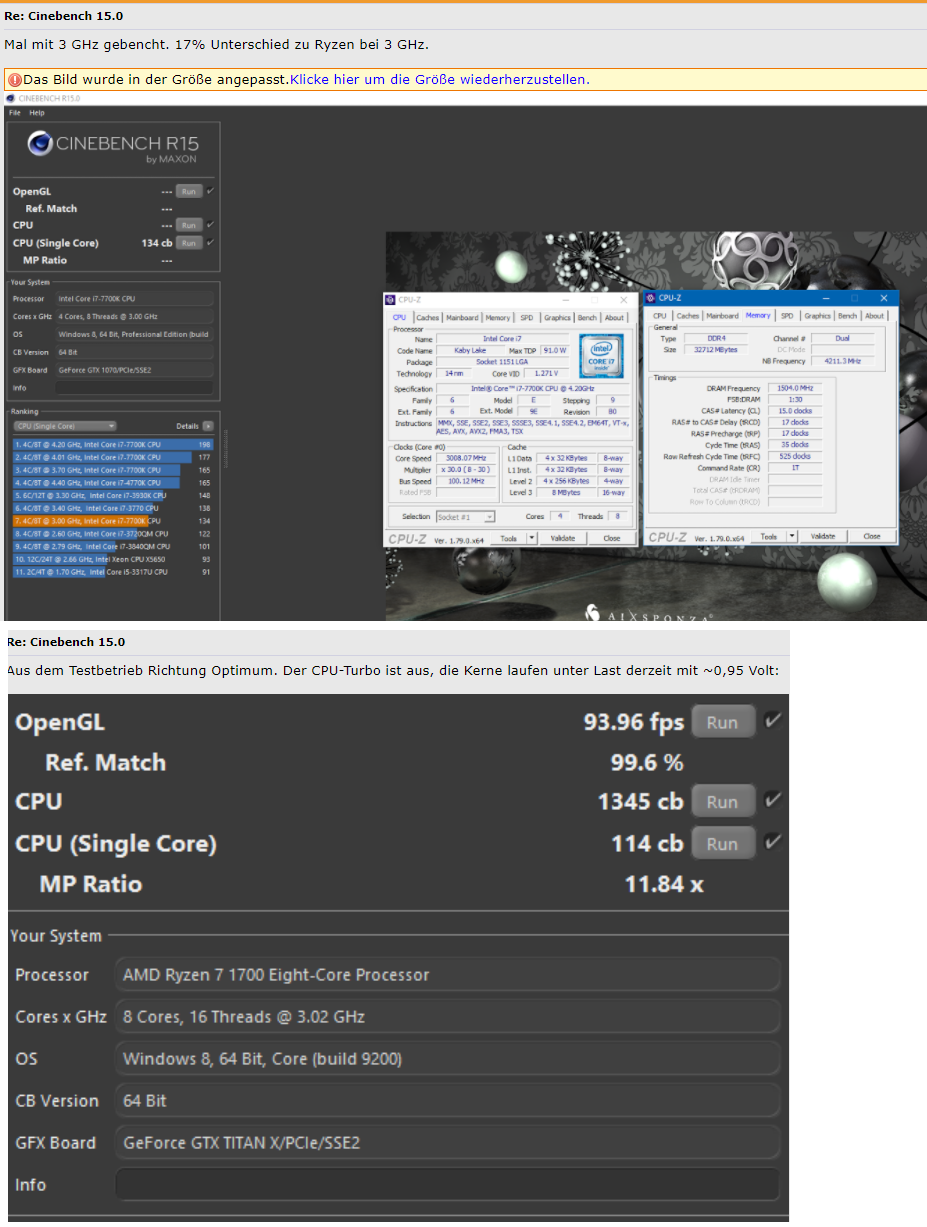 Ansonsten sind die Unterschiede gering. Ich hab mal mehrer Läufe gemacht und eigentlich nur +-1 Punkt als Schwankung im Single gesehen. Multi ist die Schwankung dann entsprechend der Kernzahl höher (also so 8-16 Punkte bei 8C/16T).