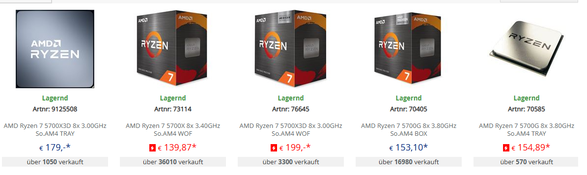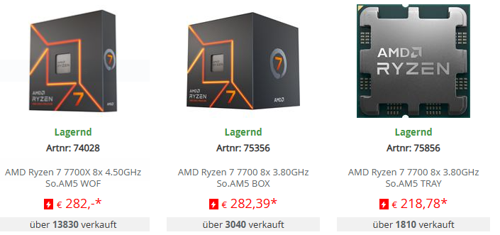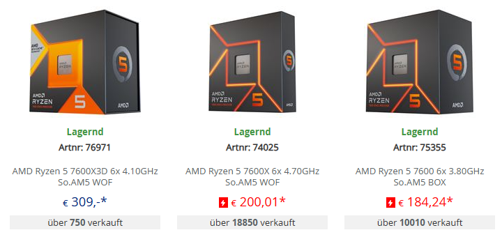 denke die werden nach und nach verschwinden, sobald die nderen auf dem Markt sind, dann kommt eventuell noch ein 7700x3d der aber weit weniger takt hat und somit in Anwendungen ohne OC auch langsamer wie der 9700x dafür im gaming besser und leicht günstiger