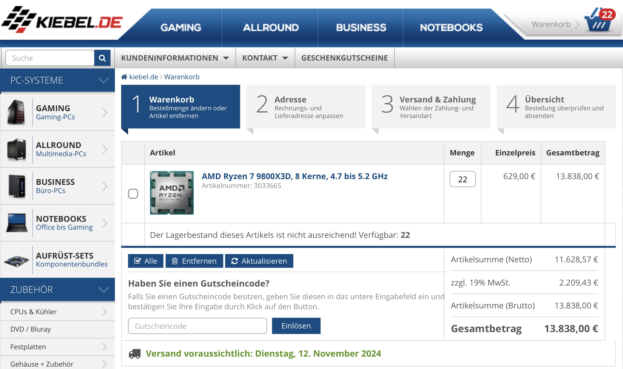 Wollte noch einen 9800x3D für meine Schwester bestellen. Ihren 5800x3D wollte ich bei eBay reinstellen, da die für über 300€ dort aktuell weggehen.