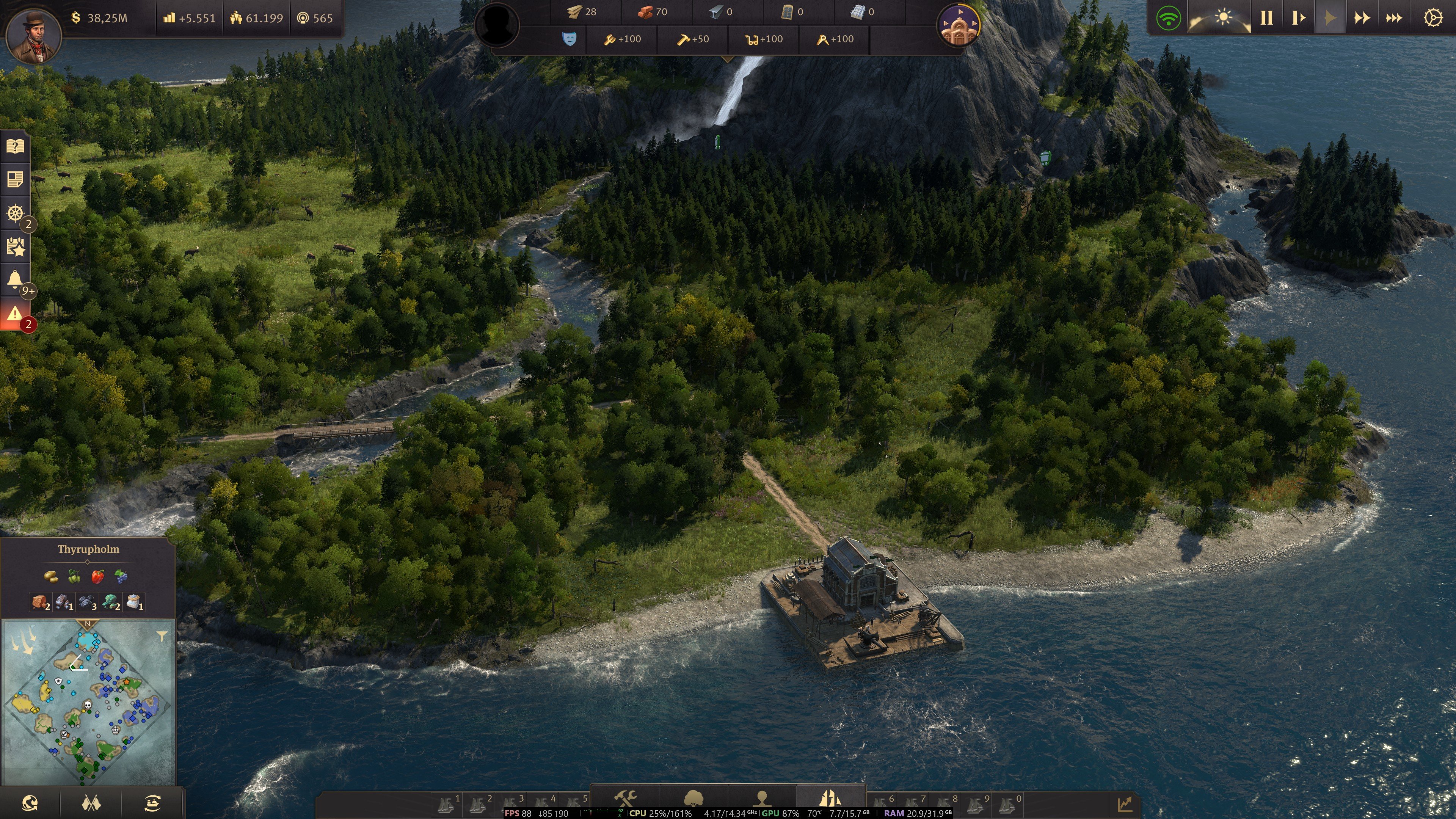 Fande die Grafik überraschend mittelmäßig. Keine Ahnung, wo die Leistung hin geht. Das Spiel scheint gut zu sein, nur kommen mir die Produktionsketten etwas erzwungen vor. Zumindest in Albion. Es scheint eher danach konzipiert worden zu sein die einzelnen Werte für Gesundheit, Zufriedenheit usw auszubalancieren, als organisch als sinnhafte Evolution in der Weiterentwicklung zu dienen. Zumindest habe ich eine ausgesprochene Gleichgültigkeit ggü der Güter empfunden und nur noch die Konzeption der Auswirkung auf die Zahlen betrachtet. Das hat eine Langeweile bei mir erzeugt. -600 bei Feuer sagt einem halt mal garnichts. Blödes Konzept.