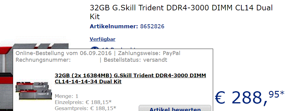 autoshot schrieb:Hab mir jetzt mal bei Amazon G.Skill Trident Z silber/schwarz, DDR4-3200, CL16-18-18-38 vorbestellt in der Hoffnung, dass bis zur Verfügbarkeit (und damit Belastung meines Kontos) noch ein bisserl Zeit ins Land streicht.