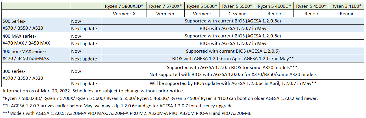 | 7.20 | 4/28/2022 | 1. Support Cezanne CPU 2. Update AMD AM4 AGESA Combo V2 PI 1.2.0.7 *This BIOS doesn't support Bristol Ridge CPU, do NOT update this BIOS if Bristol Ridge CPU is being used. **It requires to update BIOS to 7.00 before updating this version. *** User will not able to flash previous BIOS once upgrading to this BIOS version. | Download |
