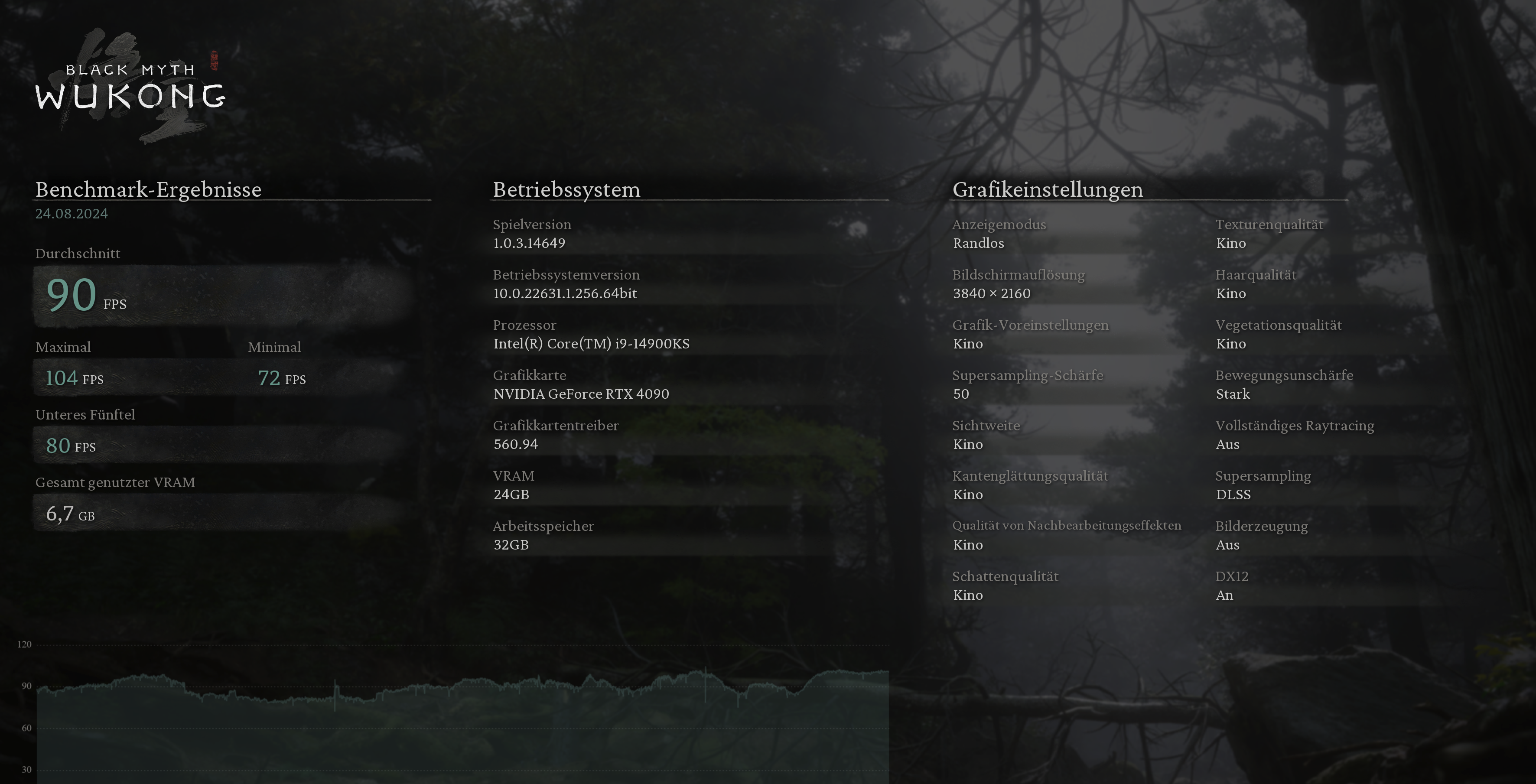 Black Myth: Wukong – 3.840 × 2.160, „Kino“ + PT Ultra, Upscaling 50 + FG: 104