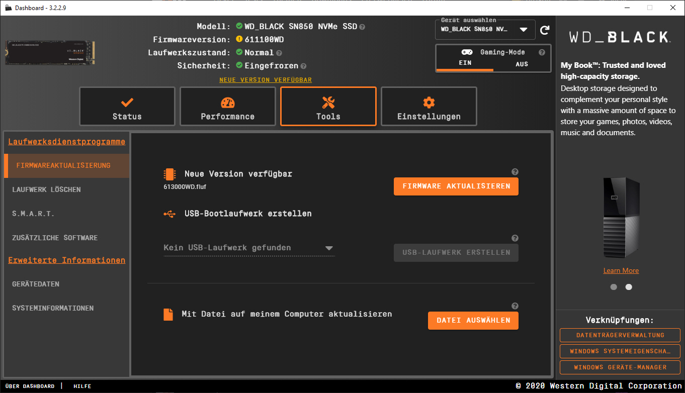 Artikel-Update: Die von ComputerBase im Nachtest der WD Black SN850 mit Kühler verwendete Firmware 613000WD steht jetzt allen Inhabern der SSD über das WD SSD Dashboard zum Download bereit. Als dem Muster in der Redaktion im April das Update, das es für die Variante ohne Kühler offiziell schon länger gab, angeboten wurde, stellte sich auf Basis von Leser-Rückmeldungen in der Community schnell heraus, dass es offensichtlich zwei Varianten der SN850 ohne Kühler gibt, die sich mindestens in der Kennung unterscheiden – und die zweite erhielt das Update weiterhin nicht.