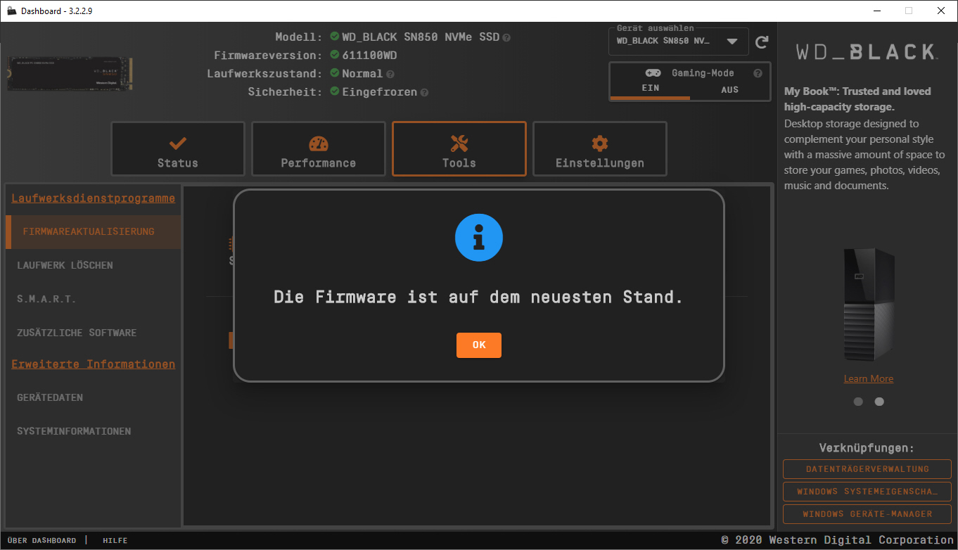 ...hat aber auch nichts gebracht (SN850 1TB ohne Kühler, Dashboard 3.2.2.9, Firmware 611100WD als aktuellste angezeigt)