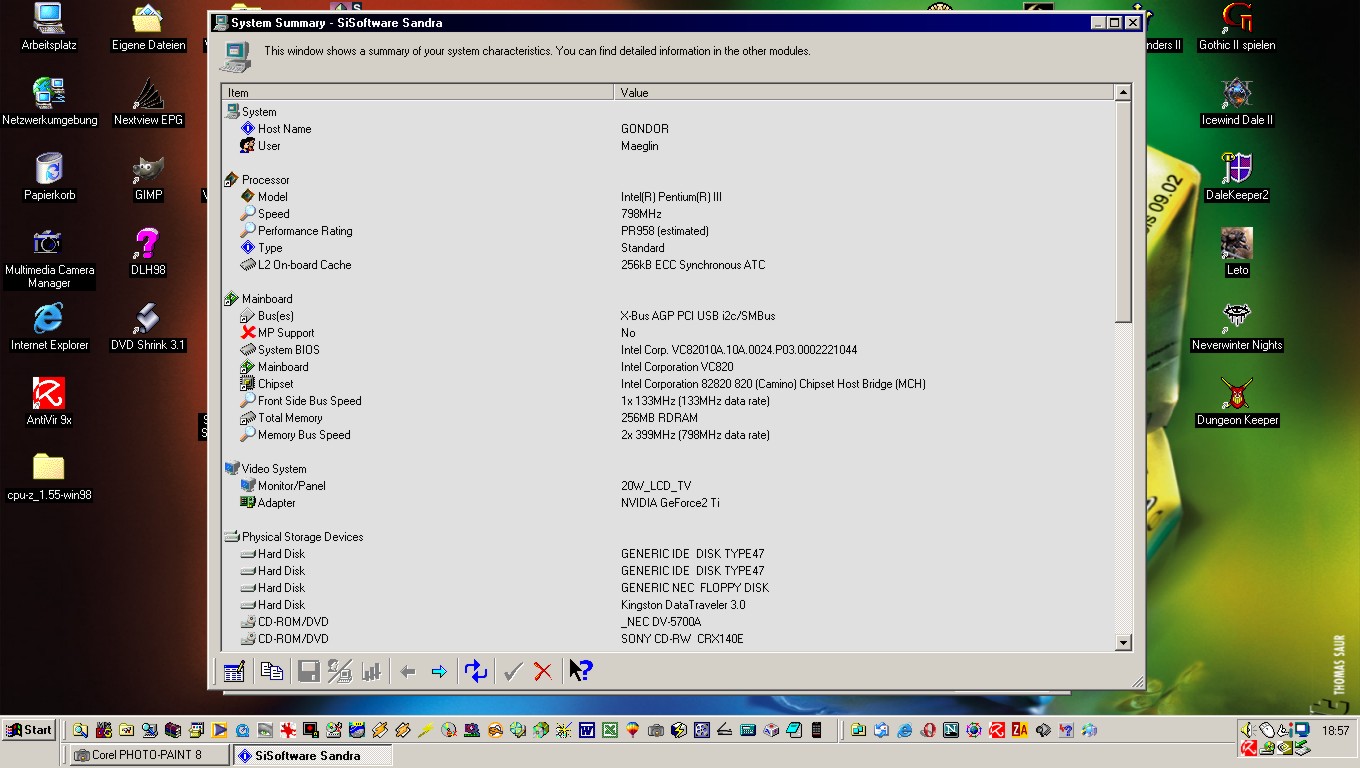 Ich hatte bzw. habe immer noch meinen Baujahr 1999-PC mit i820, 128MB und später 256MB 800MHz-RDRAM und einem 800MHz Pentium 3. Als Grafikkarte ursprünglich eine GeForce256 und dann eine GeForce2 Ti.