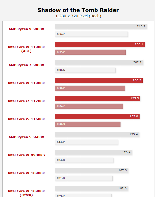 Hier ist halt das BIOS mit dem verwendeten RAM murks.Taxxor schrieb:Aber alleine die verwendete RDNA2 GPU kann ich mir nicht als Grund vorstellen, dass Ryzen 5000 so massiv über RKL in Tomb Raider steht, das sieht man sonst nirgends.