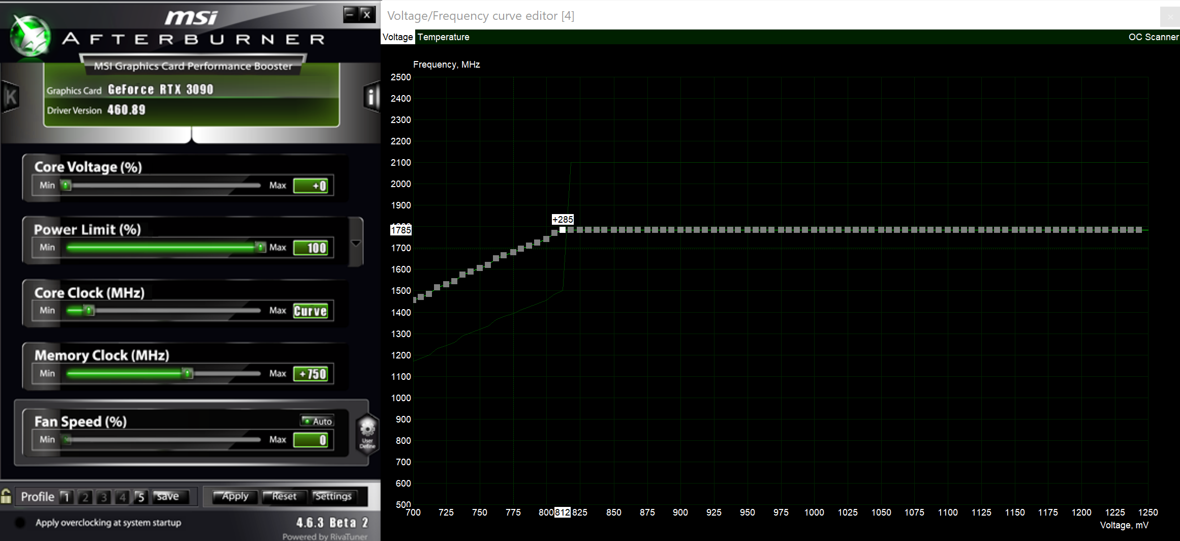Die RTX 3090 läuft übertaktet/untervoltet durch den Curve-Editor im MSI-Afterburner. I9 9900K @ 4900 MHz (1.154 V unter Prime95 Last). 16GB (2x8 GB G.skill TridentZ) Samsung B-Die @ 1.35 V mit 3800 MHz CL 16-16-16-32 tRFC 304.