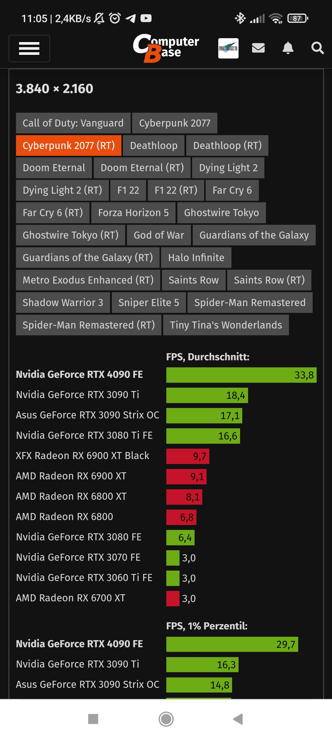 Christi schrieb:auf kumpels rechner mit 4090er läuft cyberpunk echt traumhaft. natives 4k, alles regler nach rechts und raytracing machen einen wahren augenschmaus. dazu garniert mit absurd hohen frameraten.