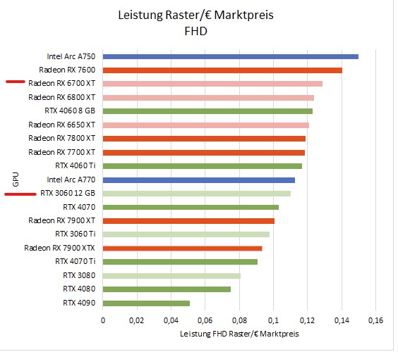 Die 6700 non XT könnte theoretisch eine interessante Karte sein wenn sie besser und vor allem stabiler verfügbar wäre, Preis und Leistung ähnlich der 7600 aber mit voller Anbindung und 2GB Vram mehr aber bedauerlicherweise zu starken Schwankungen und der Verfügbarkeit.
