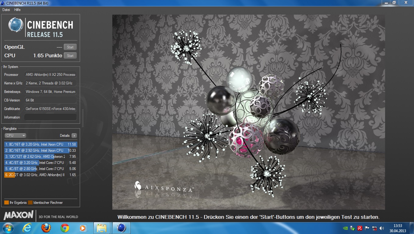 Lord Extra schrieb:Der Athlon II X2 250 erreicht im dem Cinebench 1,73 Punkte. Steht auch so in der c't. Die Werte lassen sich ja skalieren.