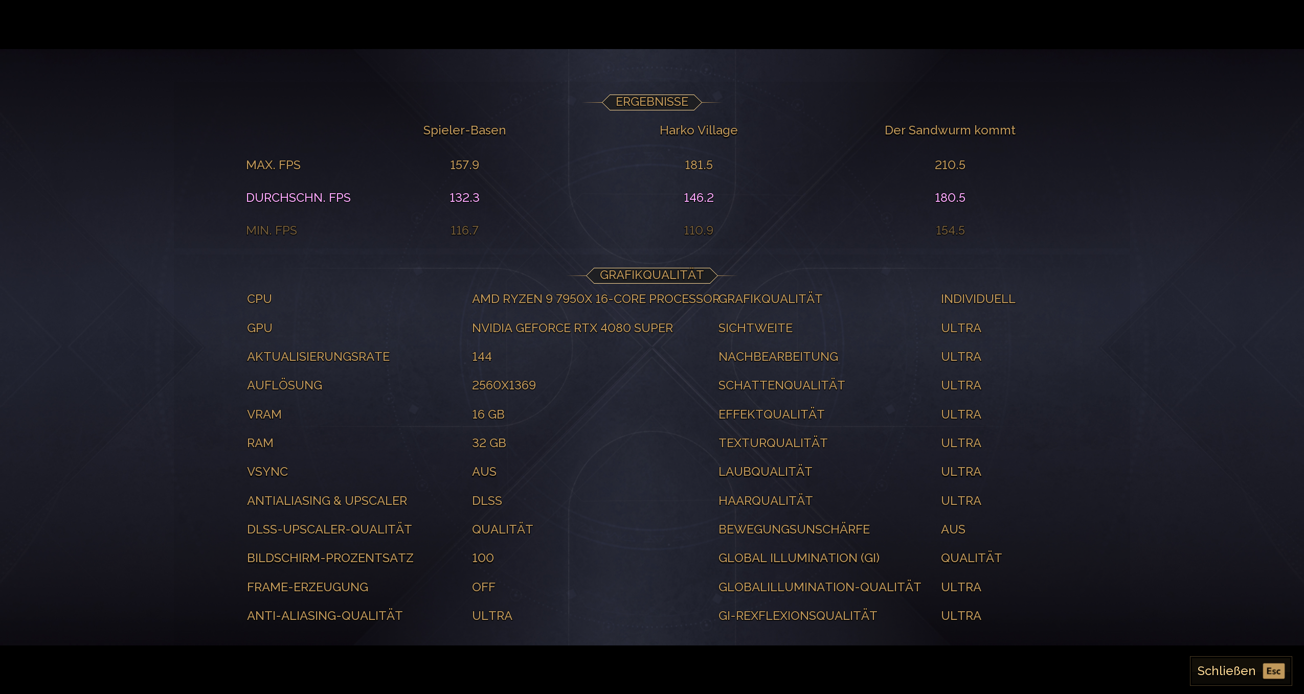 2.560 × 1.440, „Ultra“, DLSS/FSR Quality, FG Aus – AVG-FPS Spieler-Basen: 125,8