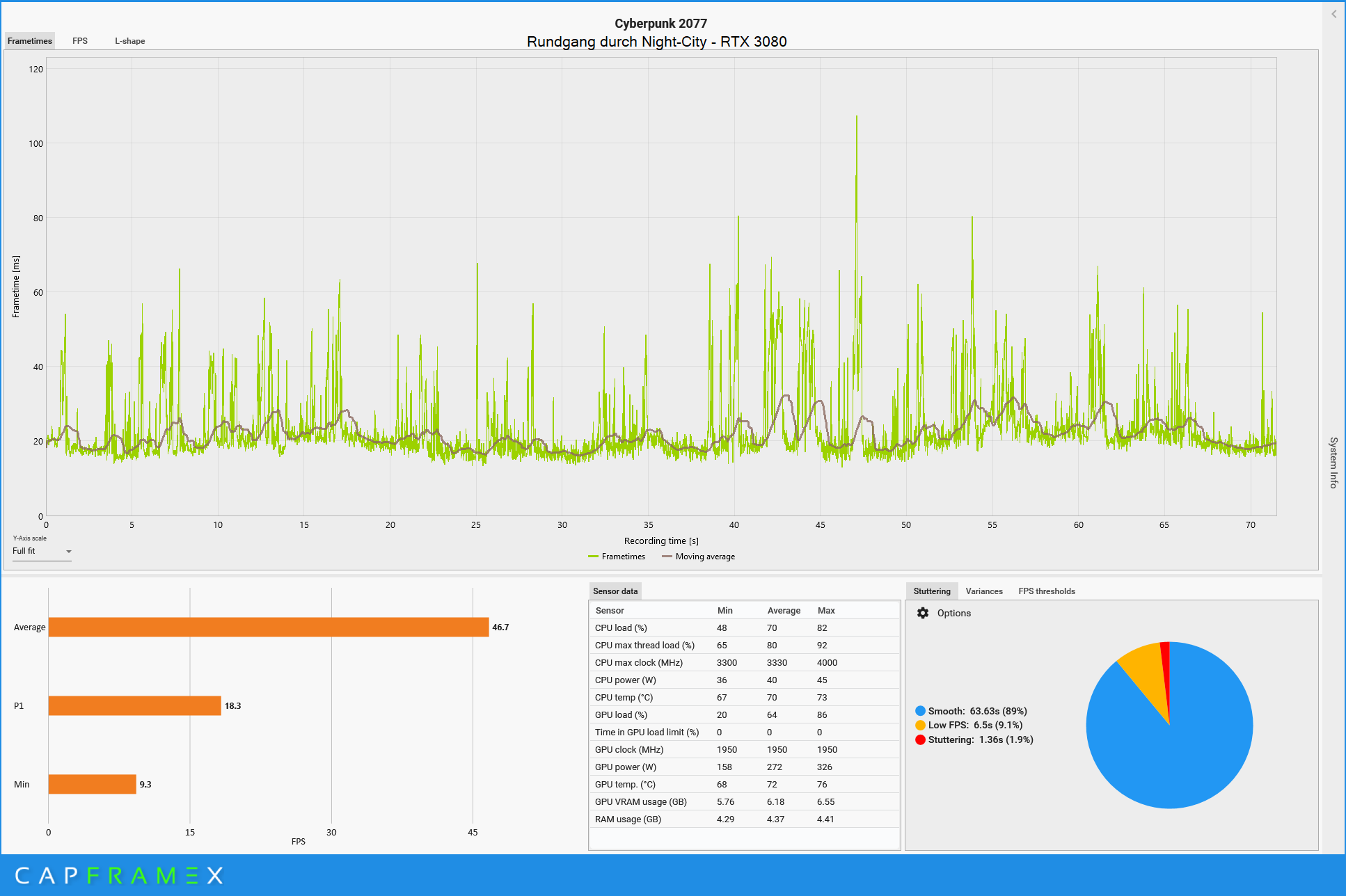 Hier habe ich einmal den integrierten Benchmark und dann eine eigene kleine Testsequenz mit einem Rundgang durch Night-City gemacht. (Ähnlich wie der Community Benchmark vom Witcher)