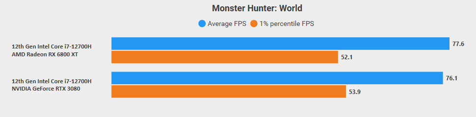 In Monster Hunter haben wir ziemlichen Gleichstand. Die 1% FPS sind auf der RTX leicht besser, allerdings ist das Spielgefühl auf beiden Karten identisch und ich könnte in einem Blindtest wohl keinen Unterschied ausmachen. Es läuft gut und flüssig.
