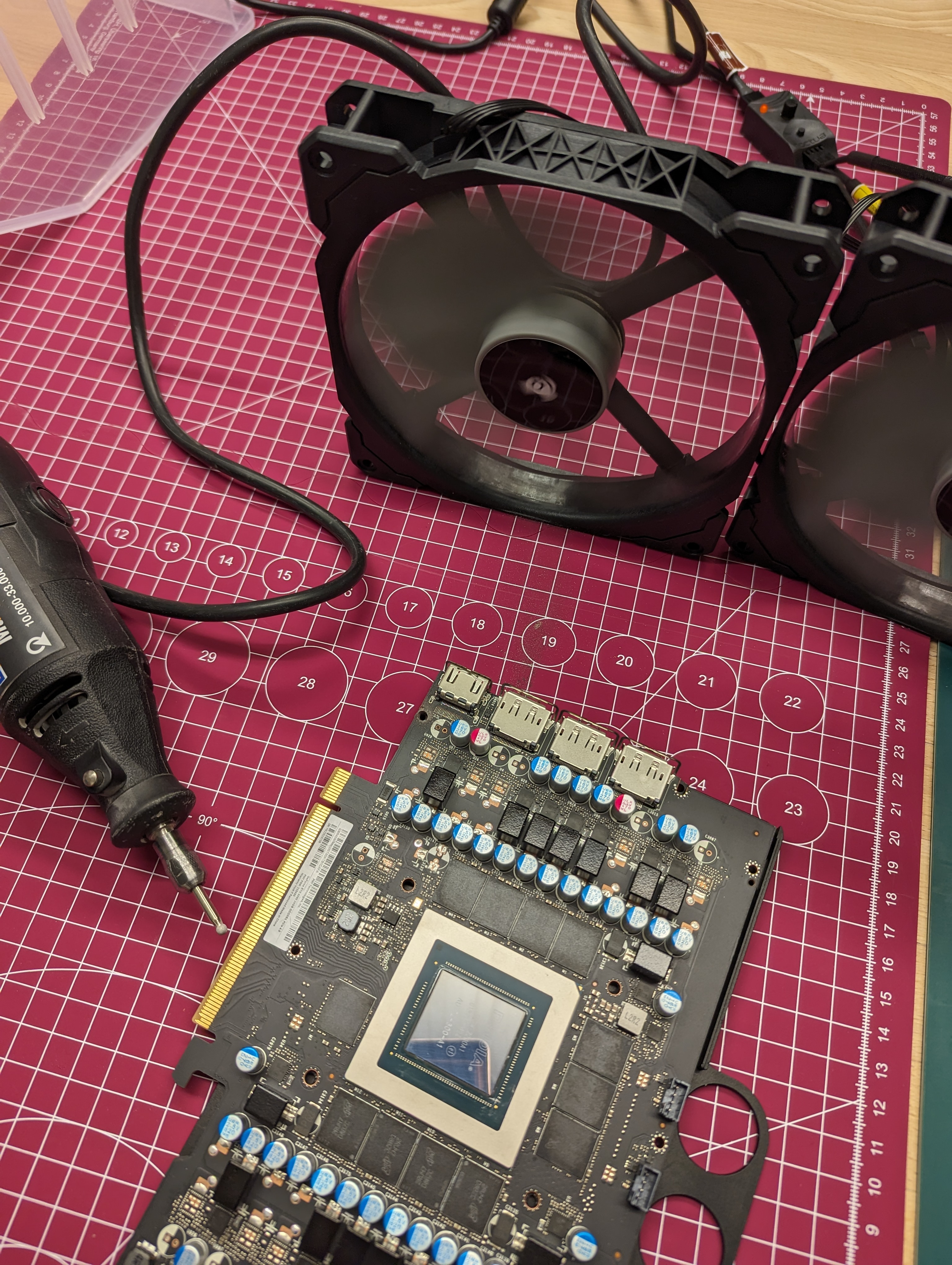 Danach die Karte vom Staub befreit, nochmal mit ISO gereinigt und diesmal die ThermalGrizzly WLP aufgetragen. Die Pads auf dem Speicher hab ich bisschen flacher gedrückt. Mal sehen was die Temperaturen machen.