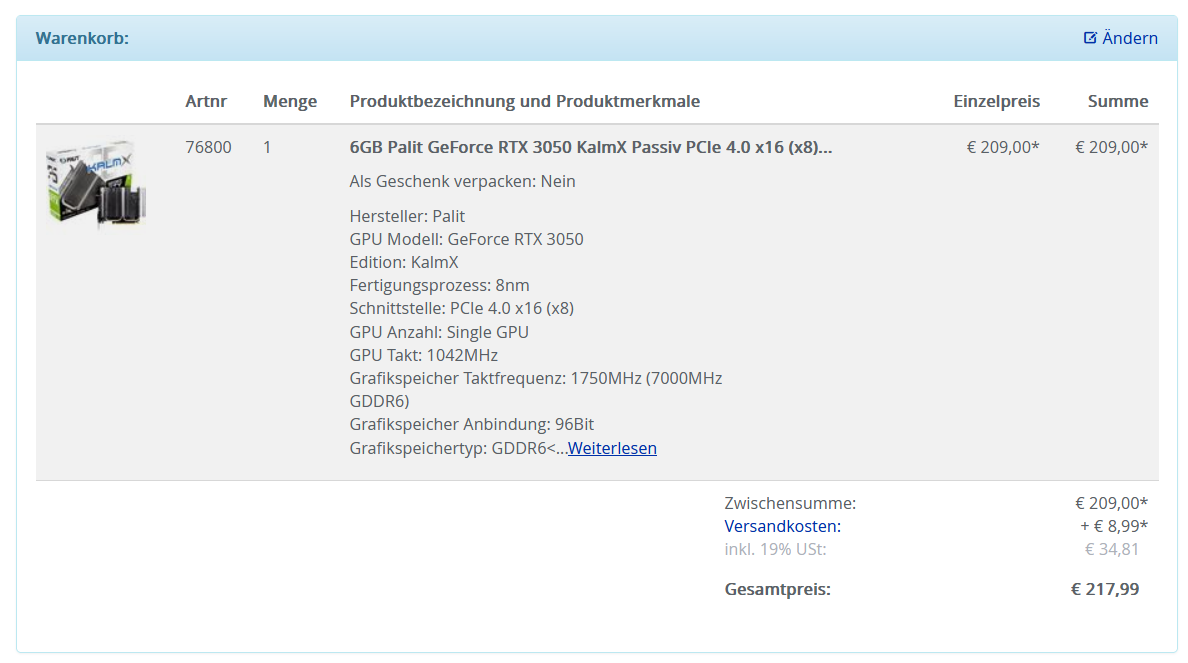 PALIT bringt die 3050 Passiv Karte ja auch nicht nur aus Jux. Die wissen eben, daß es dafür einen, ja, kleinen, aber eben nicht winzigen Markt gibt. PALIT wird die Karten schon loswerden, wenn die Preise nicht verrückt hoch sind.