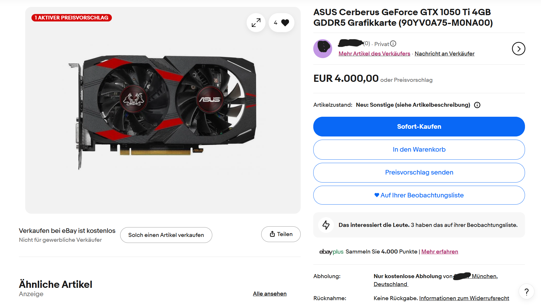 ebay wird das sicher klären. Und sollte da nichts dran sein, kann der Betroffene seine Karte wieder einstellen ohne das es für ihn ein Nachteil hat. Im Gegenteil! Wenn der Preis nur falsch war, kann er es jetzt richtig machen. Einen korrekten Handel hätte er für 4000,- € sicher nicht gemacht.