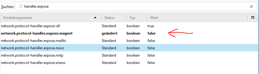 Unter Eigenschaftsnamen network.protocol-handler.expose.magnet eintragen -> Dann Boolean Wert false