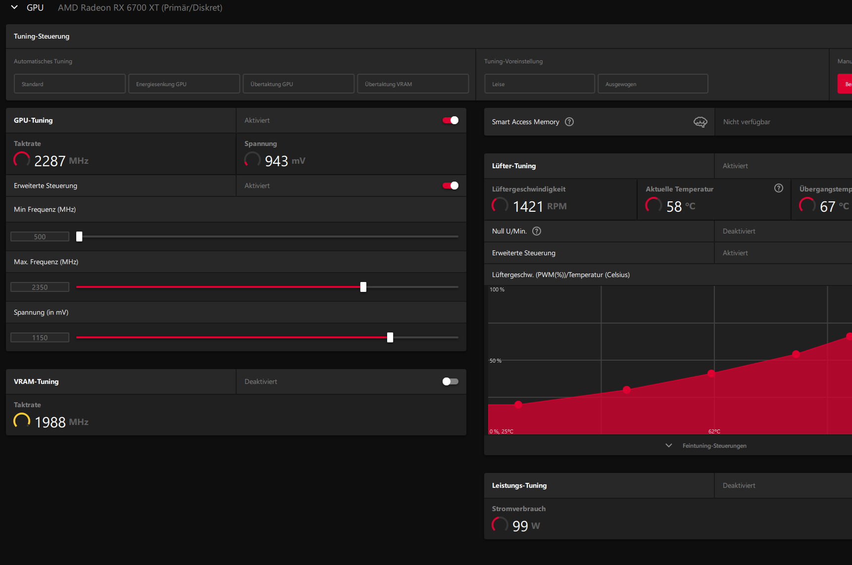 Kann ich so unterschreiben. Hatte mal spaßeshalber ein paar Effizienztests mit Furmark gemacht. Die RX 6600 lief am besten bei ~1600 MHz und 1060mV. War nicht 100% stabil, aber 1080mV lief eigentlich durchgehend supi. Für extra Sicherheit bei 1100mV laufen lassen.SANDTIGER schrieb:Da musst du aber noch ein bisschen daran arbeiten ich hab hier die große Schwester 6700XT und Diese verbraucht ebenfalls 100W![]()