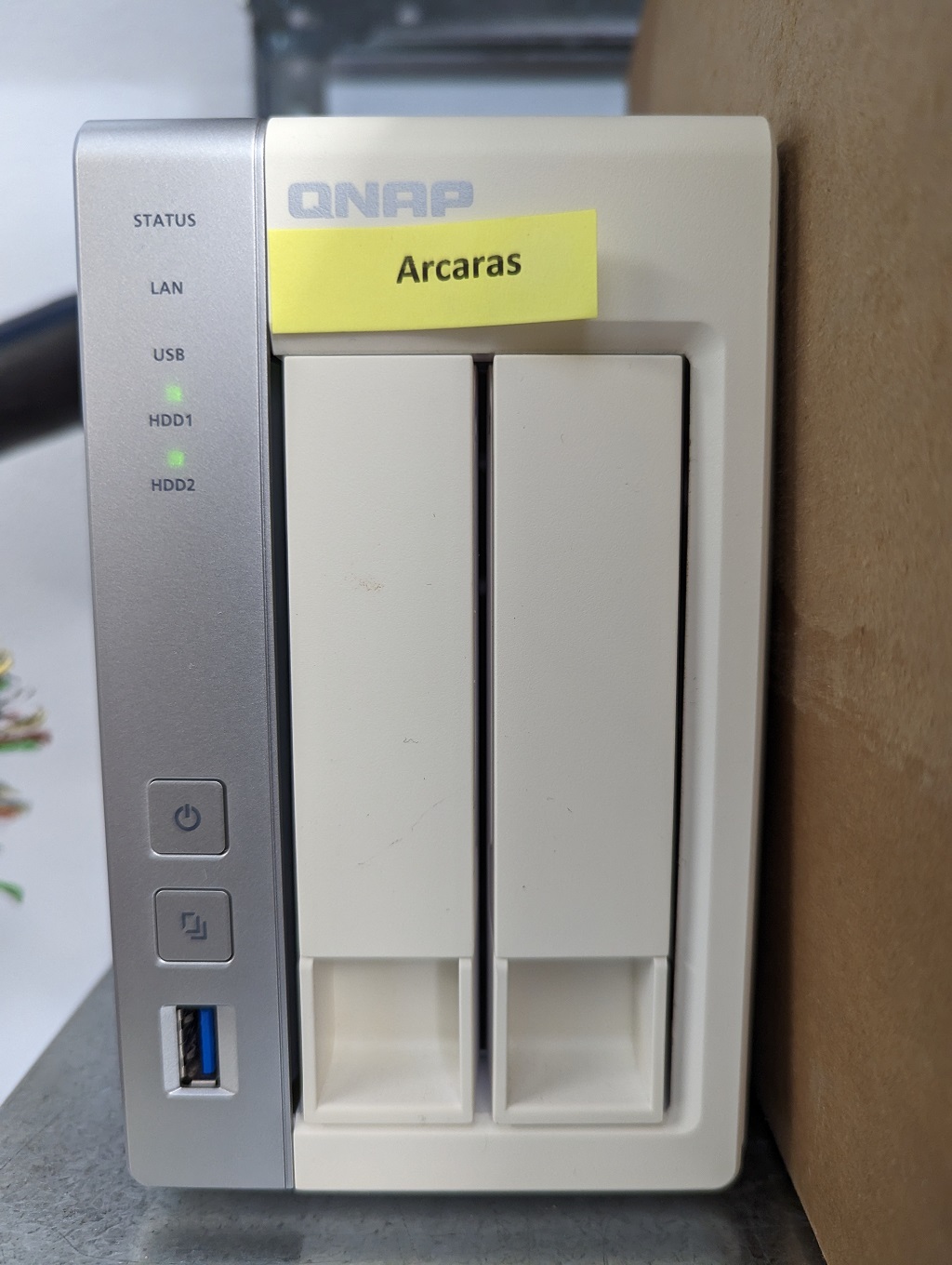 ist ein AMD Ryzen 3 2200G mit 2x8 GB DDR4-3200 auf einem MiniITX-Board mit B450-Chipsatz, 256 GB NVMe-SSD für das System und 3x 4 TB SATA-SSDs als RAID5. Darauf läuft Debian 11 (Debian 12 ist noch nicht mit OpenMediaVault kompatibel) mit OpenMediaVault, miniDLNA und pi-hole. Er hat eine 2.5 GBit LAN-Karte, die an einem QNAP 5-Port 2.5 GBit Switch hängt.