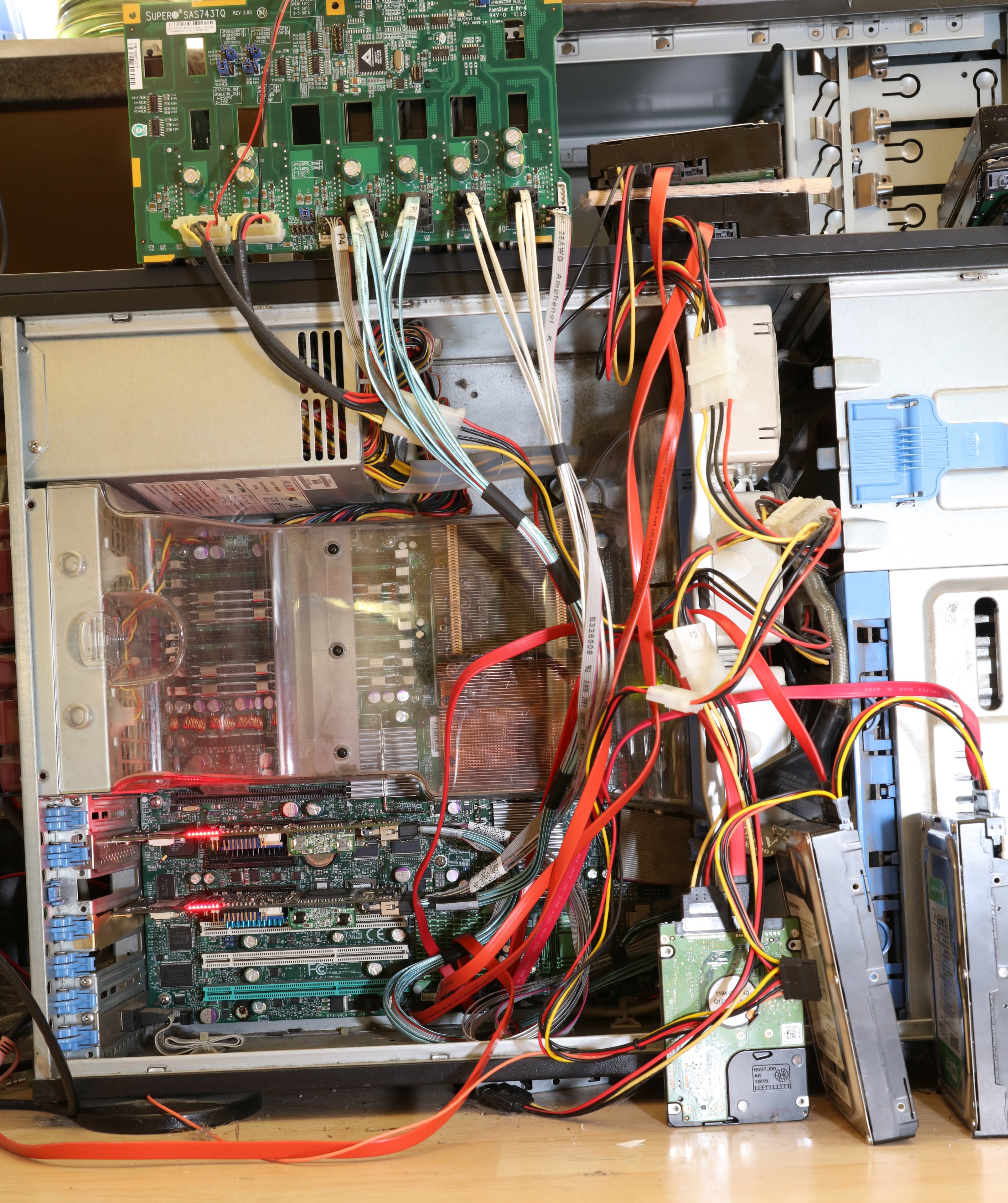Der Inhalt ist neuer als das Gehäuse. Zu sehen ist natürlich ausgerechnet die alte 2TB WD, weiter unten ist aber auch eine neuere Seagate-Platte und an der Seite eine SSD.