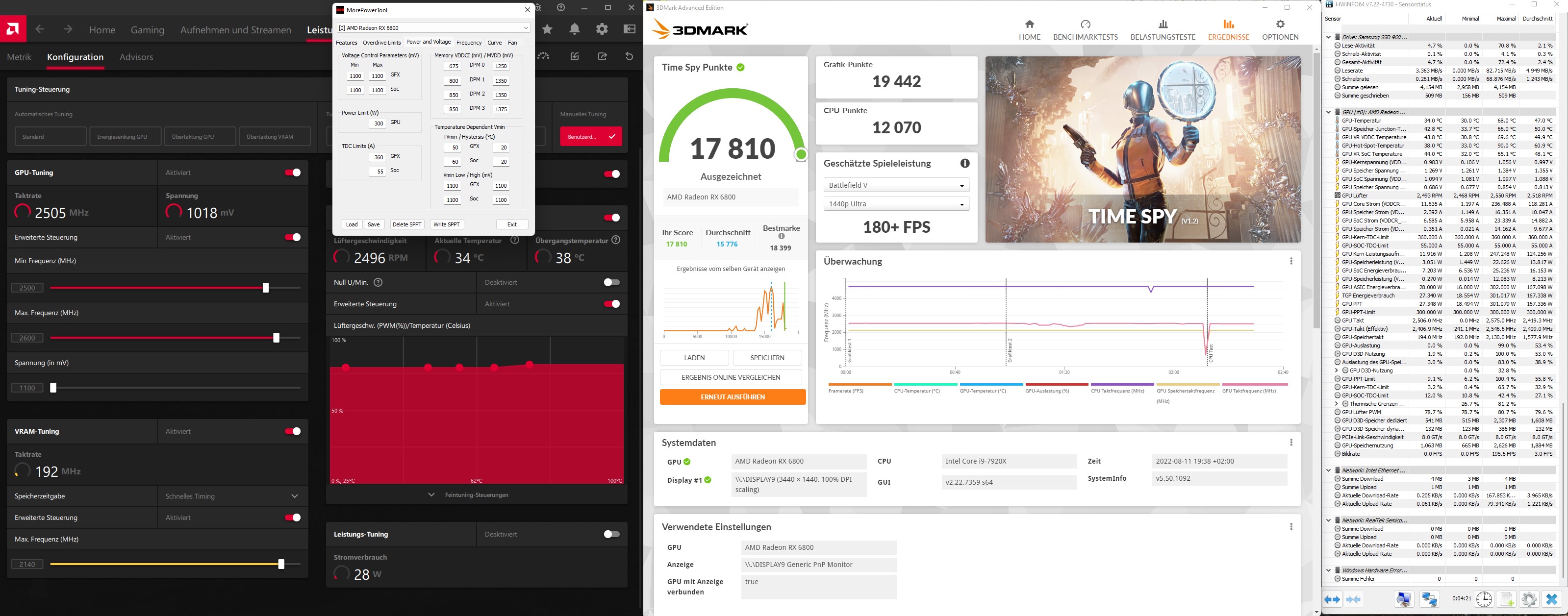 dann hast du einfach von der Materie keine Ahnung, ich hab meine 6800XT von 1150mv auf 1050mv undervoltet und diese verbraucht mit über 250MHz OC nun genauso viel oder gar weniger als im Standard Modus mit 1150mv bei 2280MHz und komme damit fast an die Leistung einer 3090Ti mit 97FPS bei Cyberpunk im ultra Preset unter WQHD und knapp 21500 Grafikpunkte im TimespyHaRdWar§FreSseR schrieb:Das mag sein, aber halte von GPU OC wenig, da es kaum Vorteile hat für mich eher negativ da mehr wärme und die Lautstärke zu nimmt.
