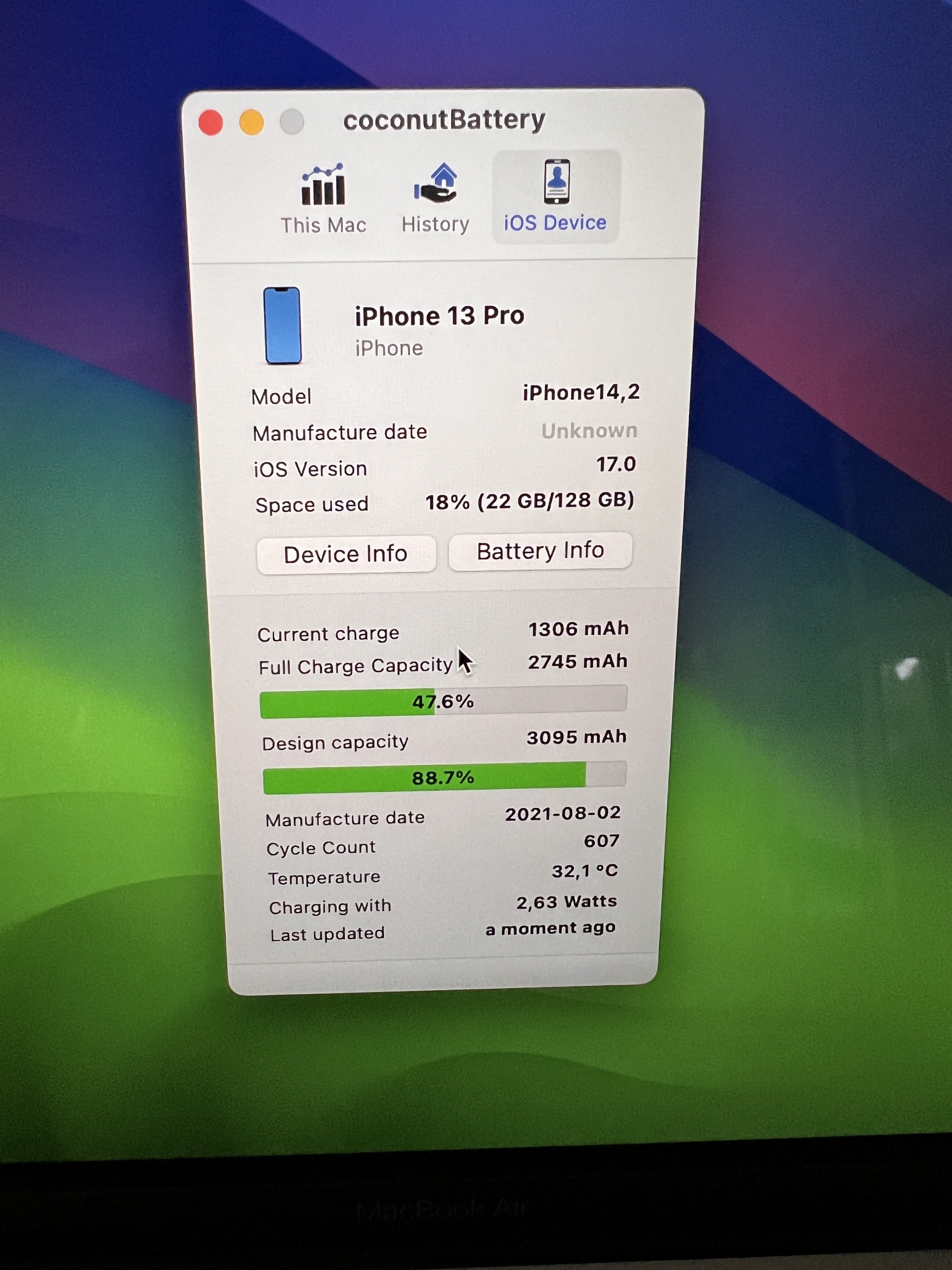 Hier mal mein 2 Jahre altes iPhone 13 Pro. Hab nun den Akku mal ausgelesen. Keine Ahnung wie genau diese Angabe ist.
