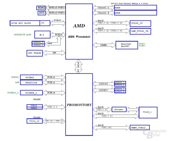 Es mag ja sein, dass die Board-Specs (im Zusammenhang mit den Chipsets) von AMD kein Support für PCIe 4.0 vorschreiben. Aber wie man aus dem obigen Diagramm einfach ersehen kann wäre für (teilweisen) PCIe 4.0 Support mit B450 keine Anpassung des B450 notwendig.