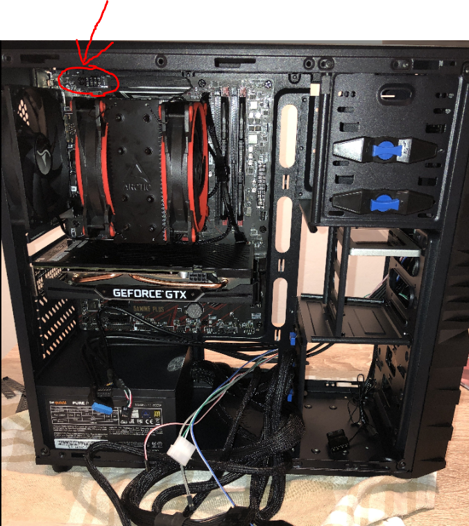 ich habs geahnt. jetzt darf er den kühler wieder ab machen denn in der regel kommt man bei solche kleinen case wo der deckel so nah am board ist nicht mehr an so mit der hand hin dass man das kabel noch einstecken kann.