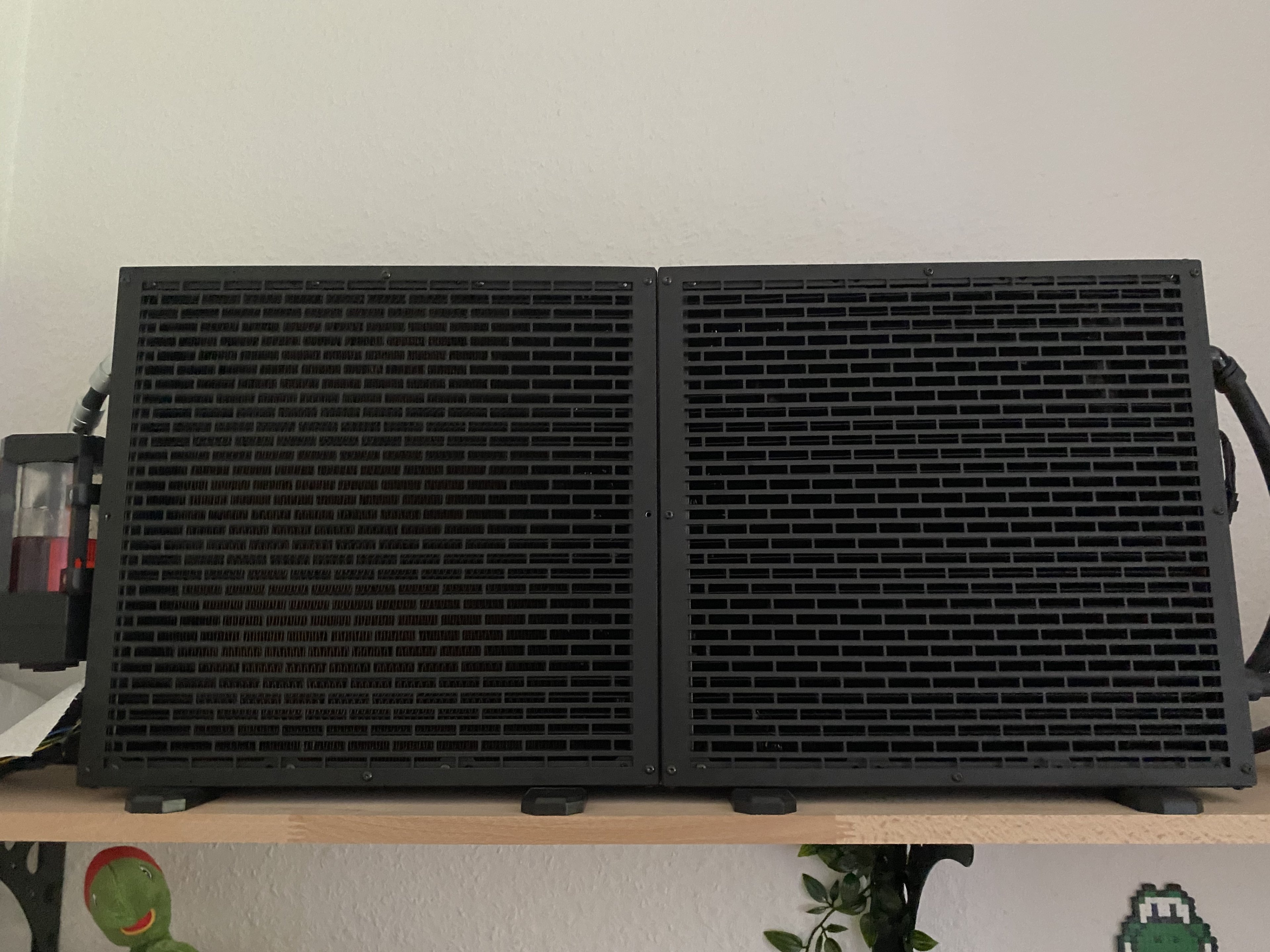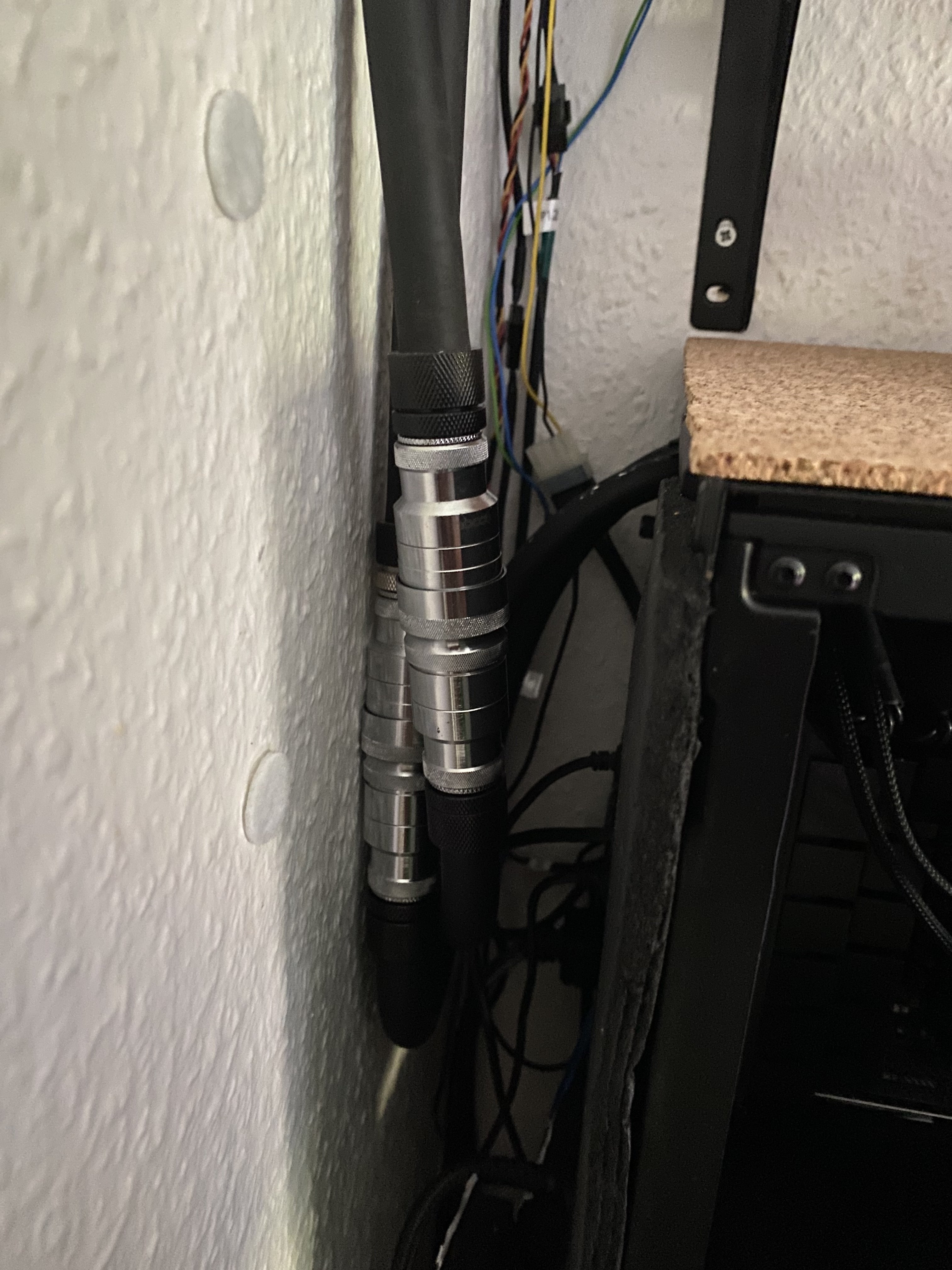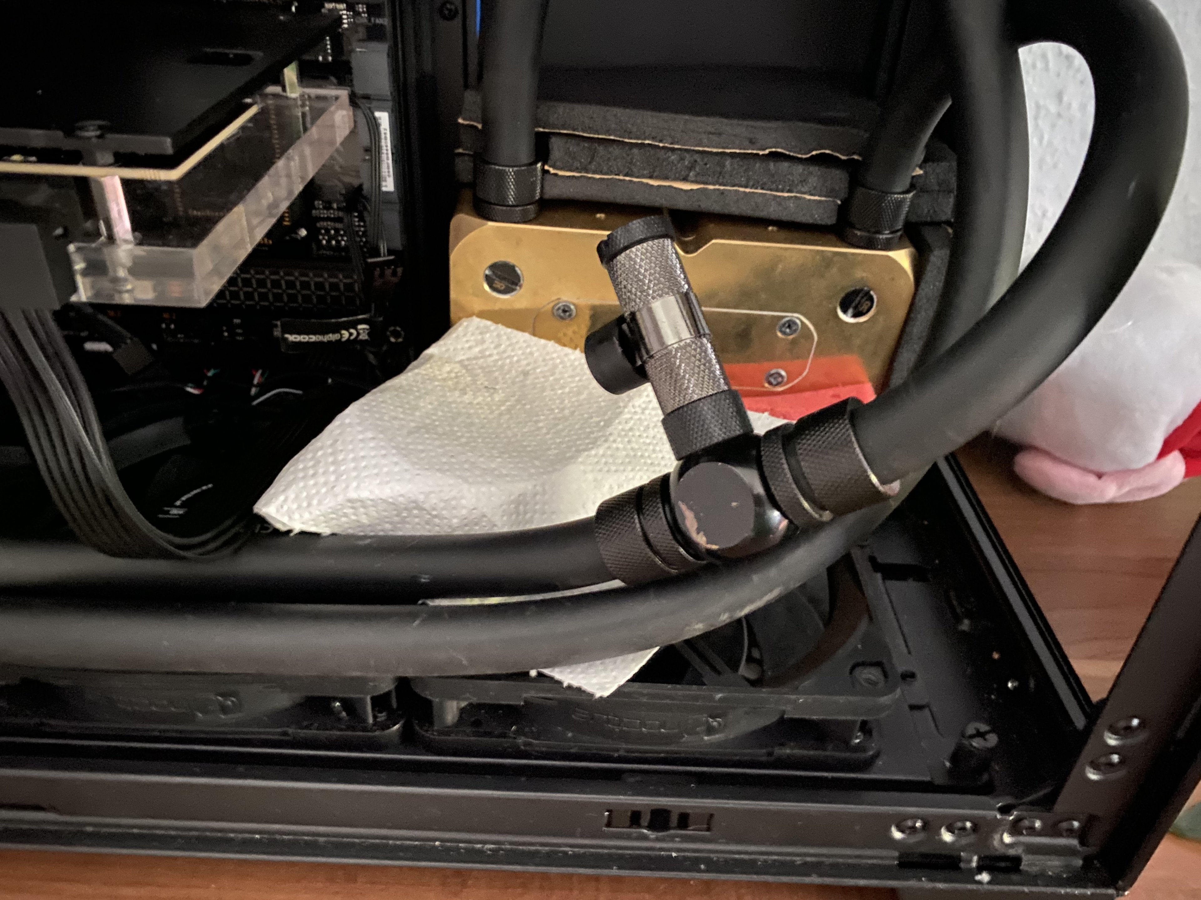 Naja eigentlich müsste das T Stück rein, weil ich zwei Stücke Aquacomputer EPDM flicken musste. Habs erst mit Zmt gemacht, aber ich hatte wieder Probleme mit der Tülle und ein fitting an der Graka hat sich raus gedreht durch die Drehung vom schlauch.