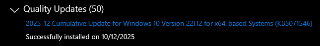 Ich bekam heute ein weiteres ESU Update. Das soll eigentlich nur dazu da sein, dass man ESU bekommt, wenn es nicht geklappt hat. Ich konnte aber ja am 12.11. schon KB 5068781 installieren und es lief soweit auch problemlos. Ich hatte ja nur 3 Versuche gebraucht es zu isntallieren. Aber eventuell lag das ja doch daran, das ESU bei mir nicht richtig funktionierte. Das neue Update ist KB 5072653.