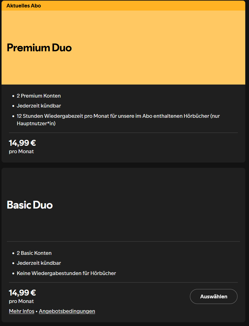Sind dann auch wirklich nur die Hörbücher raus und der Rest bleibt gleich?-Scallywag- schrieb:Für bestehende Family Abos gibt es zusätzlich diese Möglichkeit. Darin fehlen lediglich die Hörbücher.
