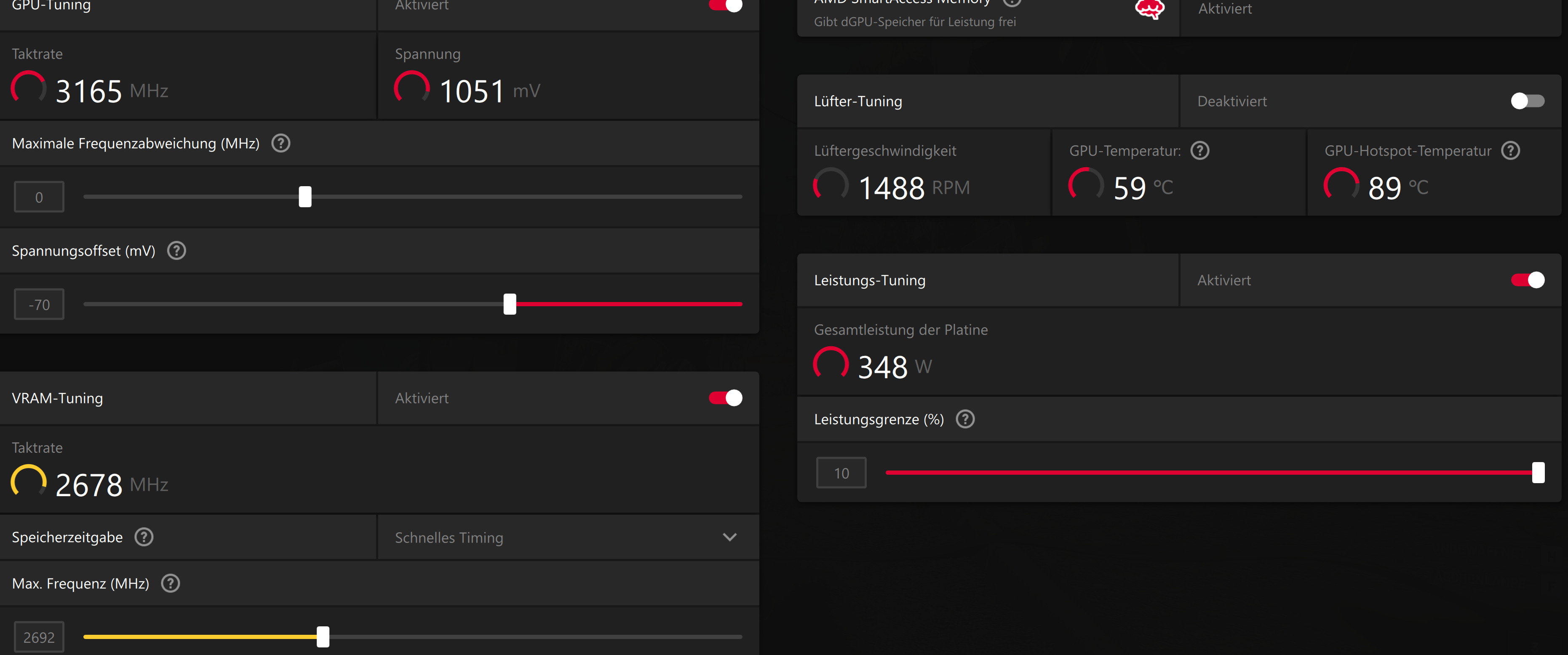 beste settinmgs sind also quasi wenn man einstellt das die Karte ca. +6 fps gain gegenüber standard settings erhält ohne zuviel watt zu schlucken