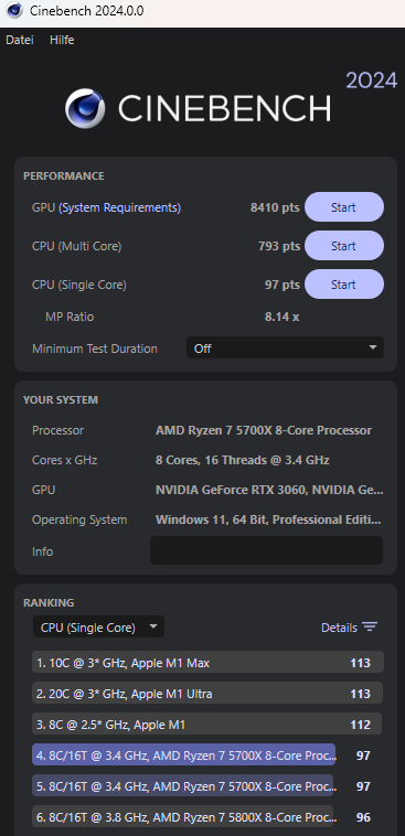 Schließe alle Hintergrundprogramme, setze Cinebench auf Echtzeit und lasse 10 Minuten durchlaufen und notiere dir alle Ergebnisse je Durchlauf und du wirst die Streuung erkennen.
