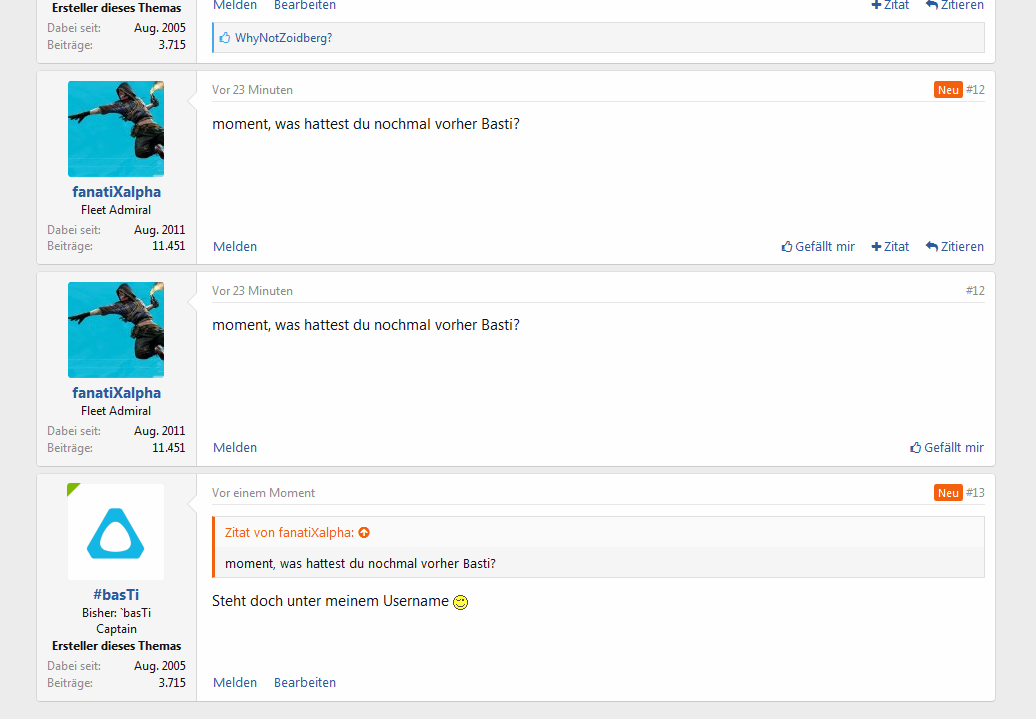 (Bislang war es im neuen Forum so, dass man binnen einer Stunde gar nicht antworten konnte und stattdessen dazu aufgefordert wurde, den letzten Beitrag zu editieren. Denn ich dachte bislang, dass bei der automatischen Beitragszusammenführung die genannten Benachrichtigungen ausbleiben würden, was vermutlich zu ziemlicher Verwirrung geführt hätte. Das ist aber doch der Fall, weshalb die automatische Beitragszusammenführung dann denke ich sinnvoller ist.)