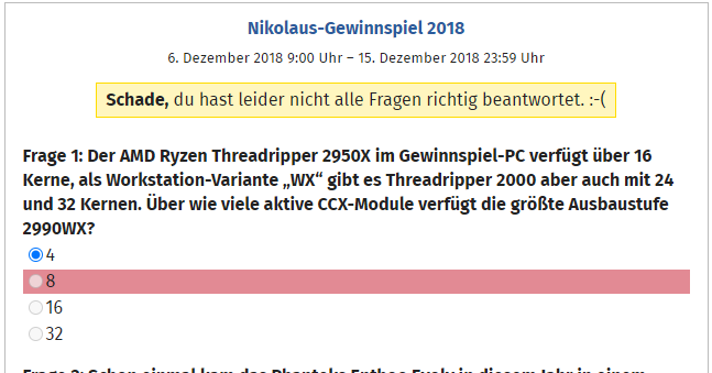 Tolles Rätsel dieses Jahr! Auch wenns für mich persönlich gerne noch was kniffliger hätte sein können. Ich hab nur die Frage 2 erstmal übersprungen und diese am Ende nochmal in Ruhe gelesen bevor ich alles verstanden habe. Der Rest war recht einfach (hab bislang eine fehelerfreie Teilnahme in allen Jahren, hoffe ich das bleibt so ).