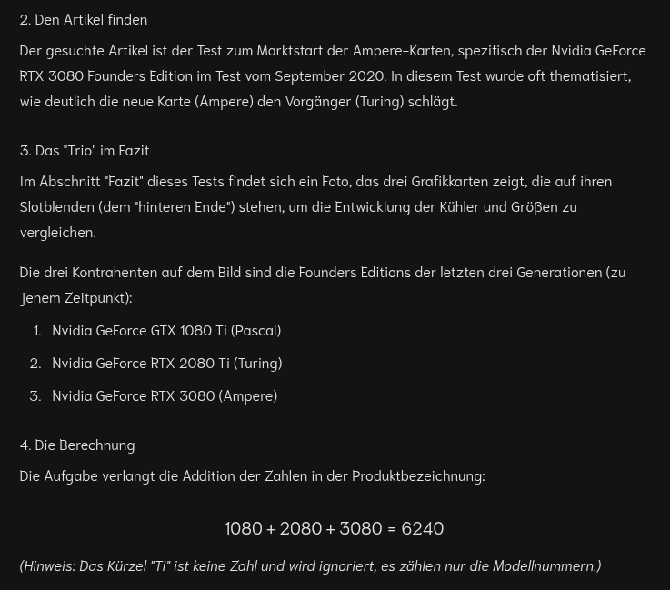 Von mir stammten die Fragen mit dem Senf, zu Ampere vs. Turing und die letzte mit den Chip(let)s. Jan hat hier nie die Originalversionen genommen bzw. meine ersten Enwürfe, sondern ein wenig vereinfacht. Ich wollte bspw. das "Senf" aus der Podcast-Notiz streichen, Frage 3 lief auf DLSS-Tests auf einer bestimmten Seite des Tests hinaus und bei der Chiplet-Frage war die Radeon VII mit dabei (bzw. in meiner ersten Idee ging es um die stärksten Modelle je Stern). In jedem Fall war auch die Formulierung ein wenig kryptischer. Die Todesjahre oder das RX-Kürzel bspw. hat Jan eingefügt.