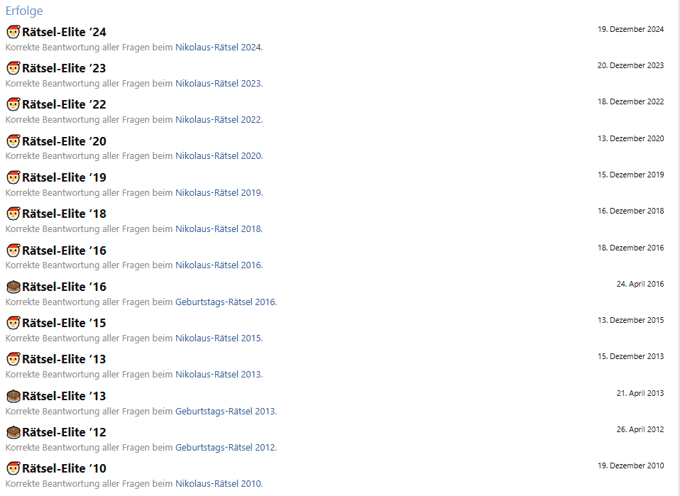 Das Nikolaus-Rätsel war dieses Jahr schon etwas schwerer, finde ich, aber weiterhin sehr fair! Beim Nikolaus-Rätsel soll es uns aber auch nicht zu schwer gemacht werden, das kommt erst beim Weihnachtsrätsel. Ein Forum-Badge für umme durch die Beantwortung von ein paar Baby-Fragen wäre dann aber auch zu günstig. So wie dieses Mal war das für mich ein guter Mittelweg aus Anspruch und Lösbarkeit.