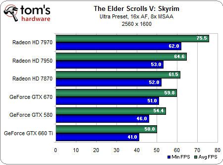 Dank kontinuierlich optimiertem Catayst-Treiber läuft AMDs HD7870 in Skyrim selbst der GTX670 auf und davon.