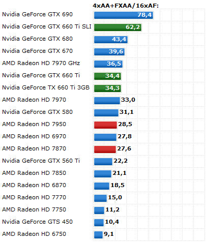 Ein Bild, das uns bereits bekannt vorkommt. Wieder einmal ordnet sich die GTX660Ti deutlich hinter der HD7870 ein. Von der HD7950 brauchen wir gar nicht zu reden.