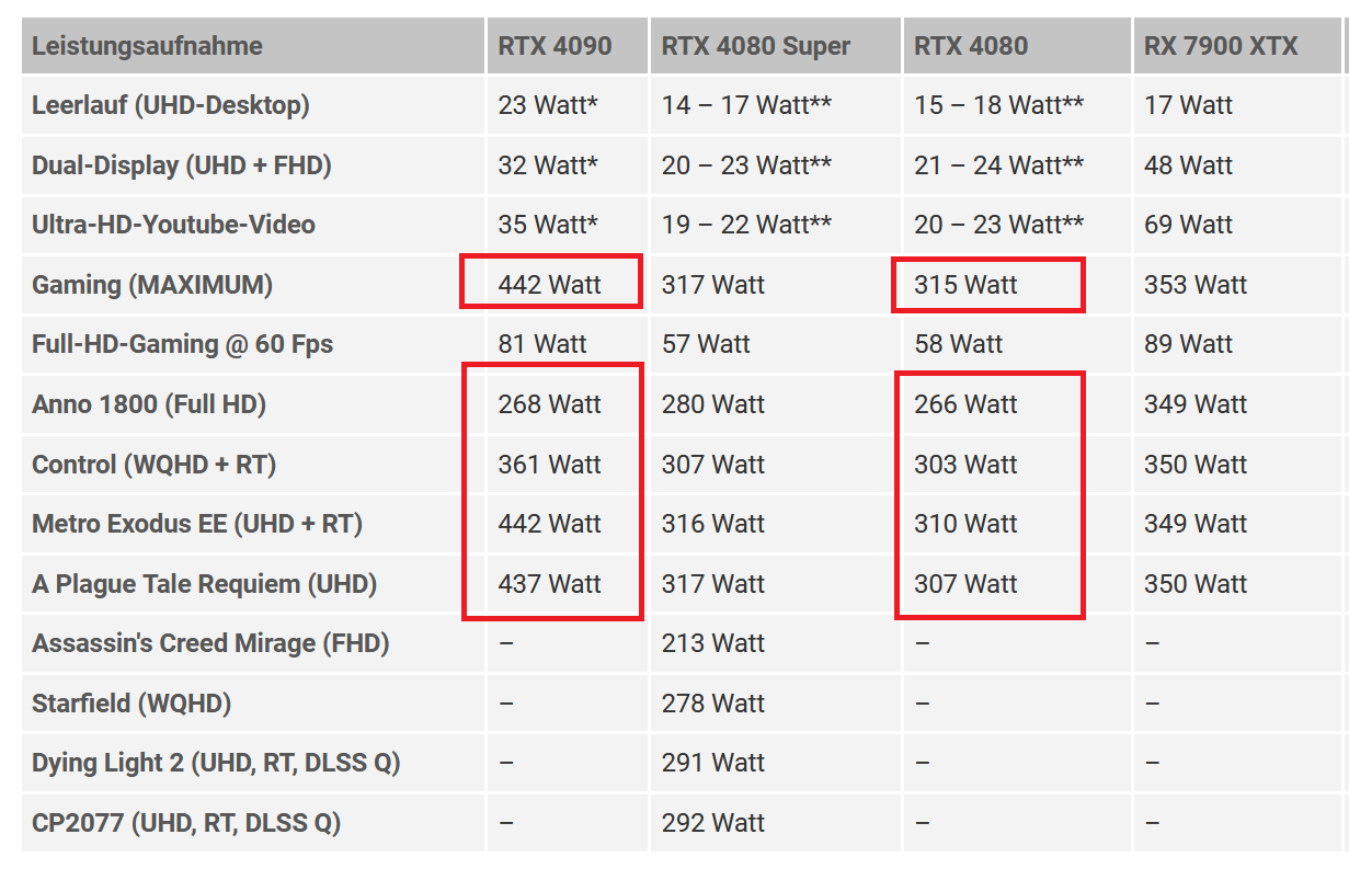 30 Prozent Mehrleistung mit ca 45 Prozent höherer Stromaufnahme" gehst du seltsamerweise davon aus, dass bei Spielen mit weniger Mehrleistungsunterschied (durch Flaschenhälse wie z.B. CPU) der Stromaufnahmeunterschied gleichbleibt und sich nicht auch verringert.