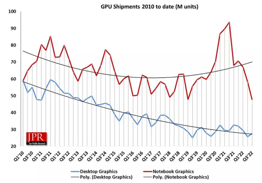 Der Desktop-GPU-Markt ist auf den Werte unter 2005 (!) eingebrochen. Team Rot hat es noch härter getroffen als Team Grün. Und 2005 ist es nur, weil wir für vor 2005 keine Zahlen haben.Piecemaker schrieb:Der GPU Markt ist durch das Ausbleiben von Minern eingebrochen, nicht weil plötzlich 40% weniger zocken.