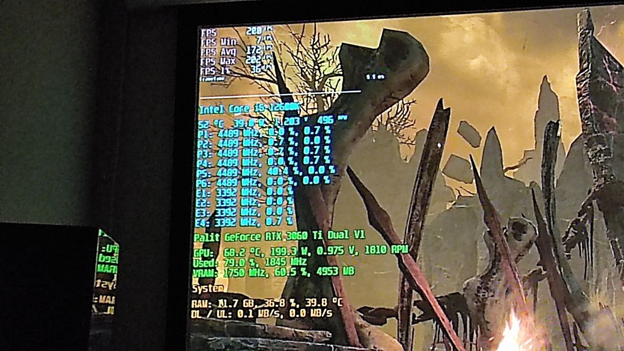 Ich habe mir bewusst eine Ecke gesucht, in der ich, wie ComputerBase auch, etwa knapp unter 180 FPS in besagten Settings erreiche - bei gleichzeitiger Vollauslastung der RTX 3060 Ti - die 200 Watt liegen an, wie man sieht.