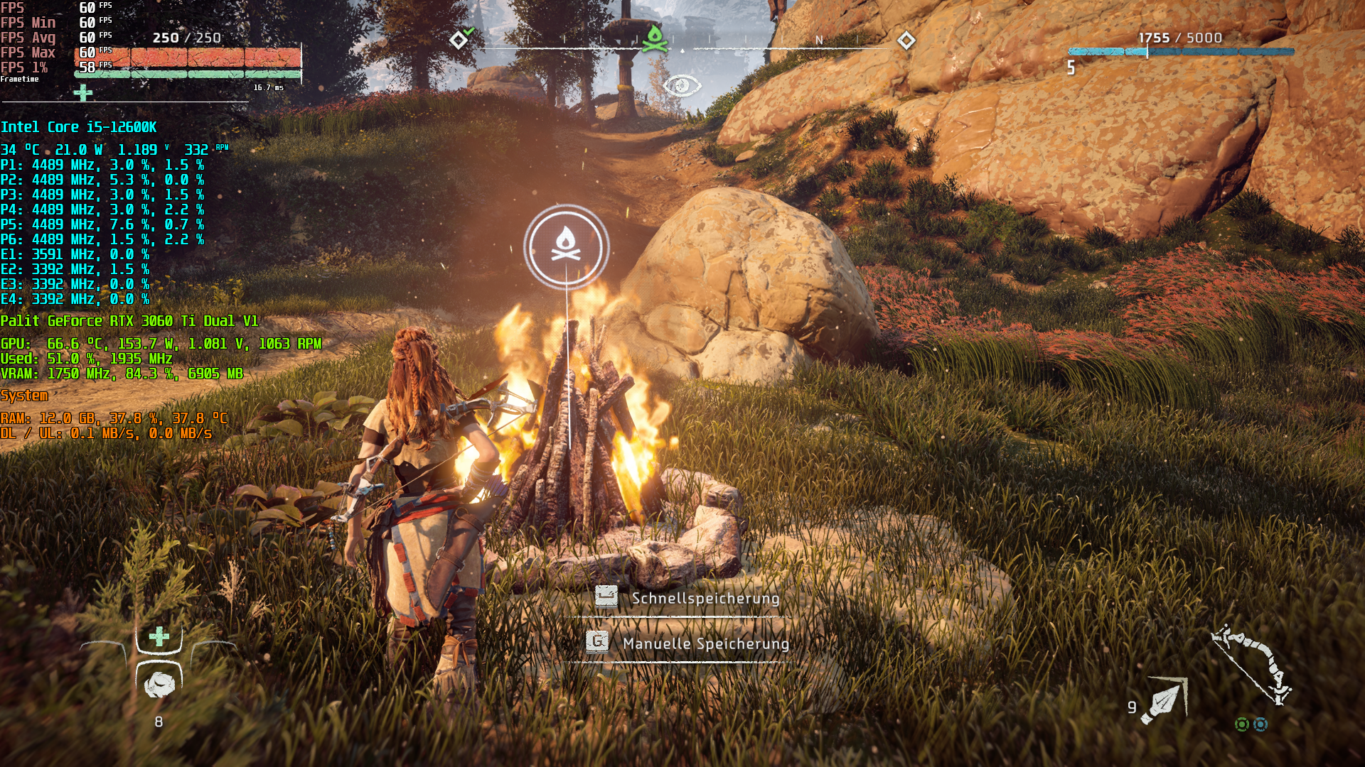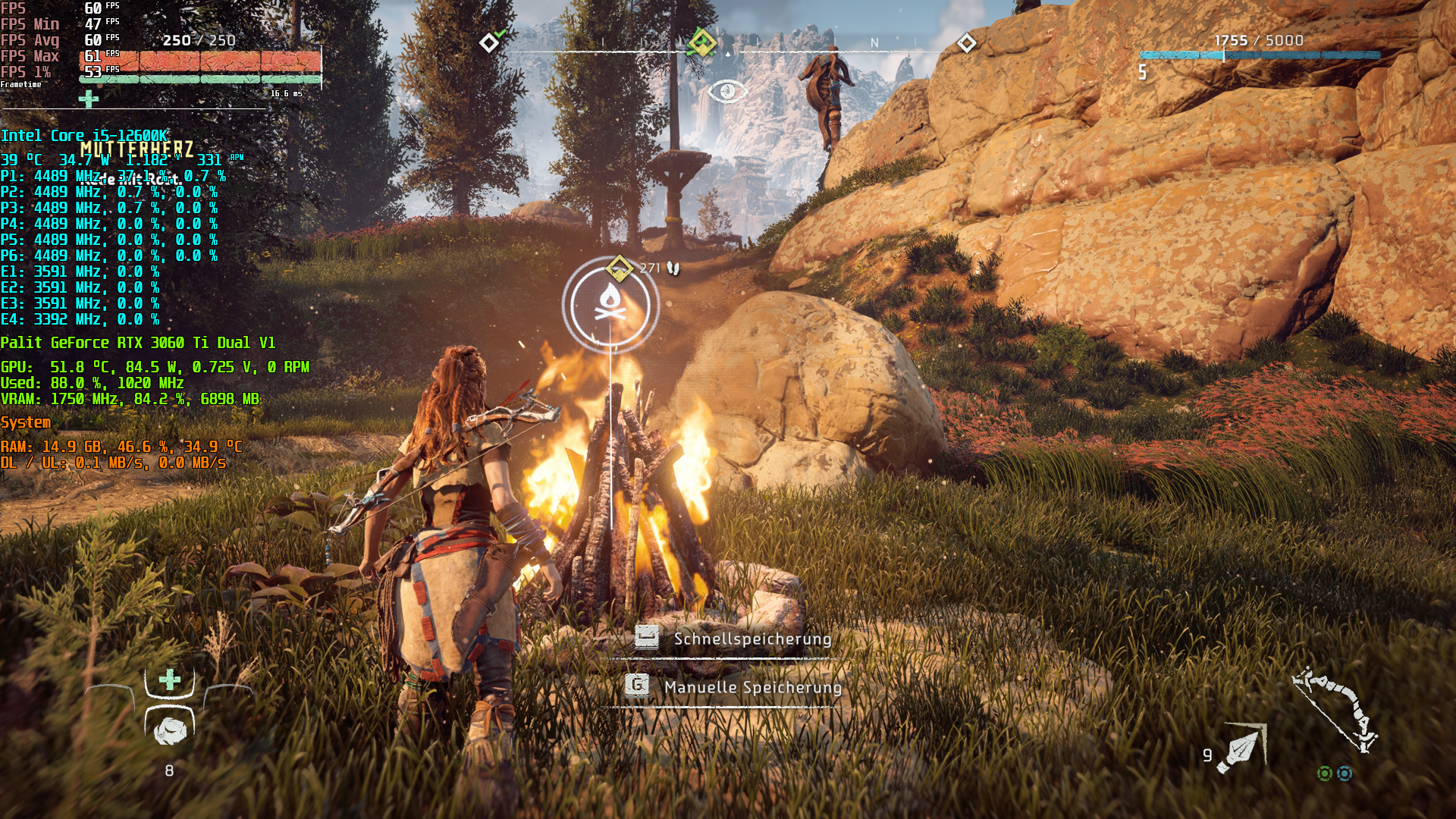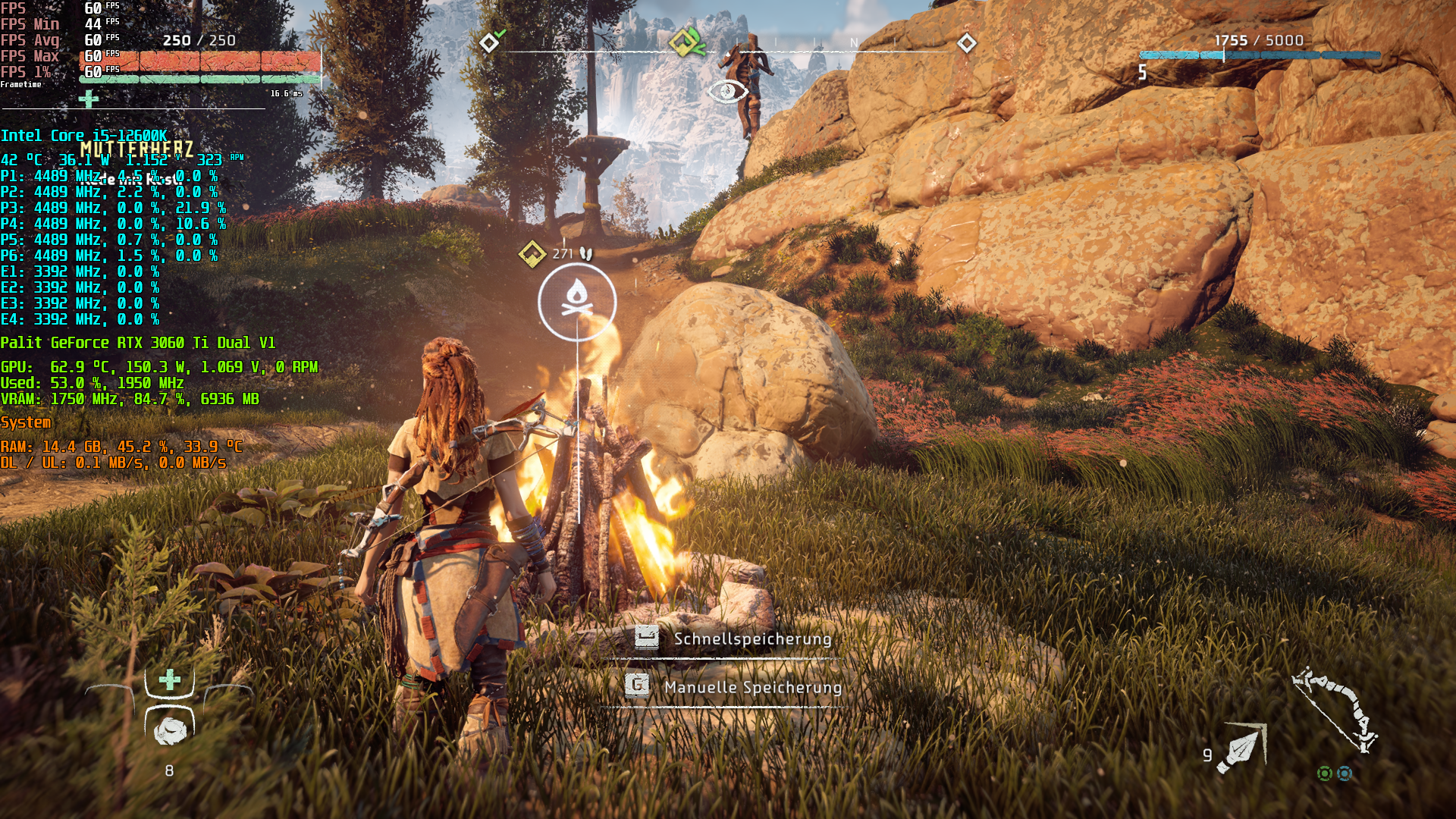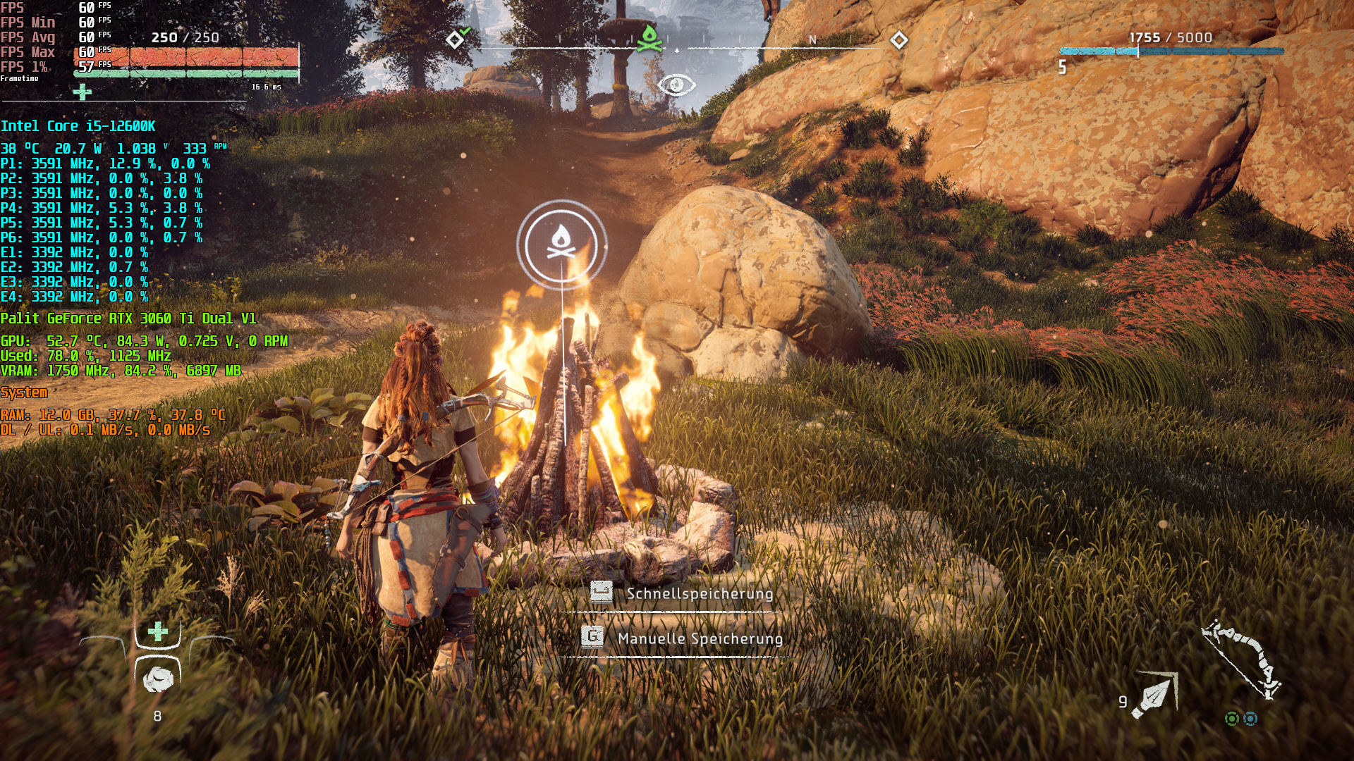 Horizon Zero Dawn - Full HD (nativ, kein DLSS), maximale Grafikdetails, 60 FPS via VSync