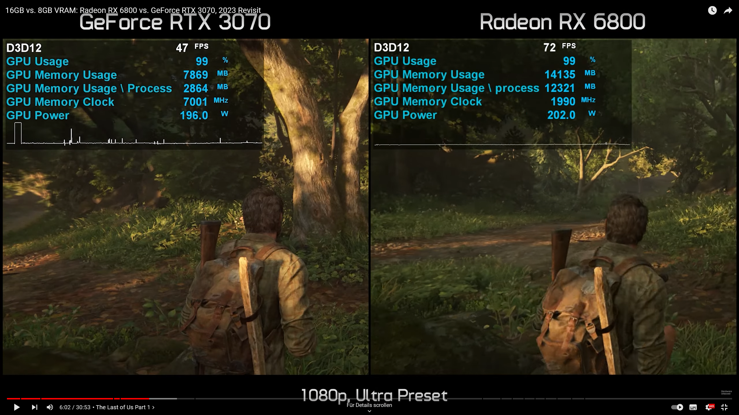 Ich glaube eher, du missverstehst den Zweck des Vergleichtsvideos. Das ist kein klassischer Benchmark-Vergleich, welche Karte mehr leisten kann. Es geht bei dem Video nur darum, aufzuzeigen, wie sich 8 GB Grafikspeicher aufwirken und dass es damit in einigen aktuellen Spielen schon bei 1080p oder 1440p zu Problemen/Einschränkungen kommen kann, obwohl die Karte selbst eigentlich mehr als genug Rechenleistung für die Auflösungen hat.